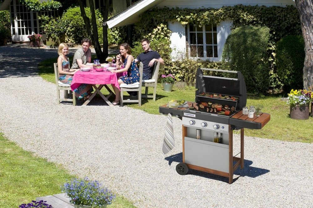 - Kontaktní plynový gril se třemi trubkovými hořáky z nerezu a konstrukcí z akátového dřeva. Grilovací plocha je rozdělená na litinový tál a rošt Culinary Modular pro snadnou přípravu pizzy, marinované drůbeže, paelly či asijských pokrmů na pánvi wok. InstaClean™ systém umožňuje vyjmutí jednotlivých dílů grilovací vany a jejich umývání v myčce. Pomocí ovládacích knoflíků a teploměru lze pohodlně regulovat teplotu. Obsahuje přední plechový kryt s přihrádkou na koření či grilovací přísady a podporu plynové lahve. Elektronické zapalování. Vyklápěcí rošt pro pozvolné grilování a ohřívání.