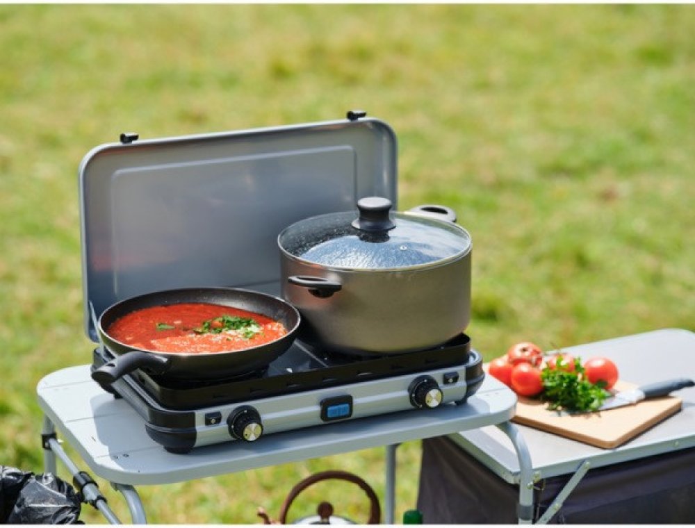 CGAZ2197173 Vařič Camping Kitchen 2 Maxi je vybaven dvěma nezávislými hořáky s individuální regulací výkonu. Při vaření pro větší rodiny nebo skupiny nabízejí velké podpěry na pánve o průměru až 28 cm / umožňují použití vašich běžných kuchyňských hrnců a pánví. I když je počasí nepředvídatelné, technologie FLAMEGUARD hořáků je navržena pro optimální ochranu plamene, tak uspoříte plyn a uvaříte ryc...