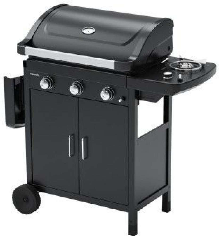 Nová řada grilů s elegantním designem. Grily se třemi hořáky a stabilnější grilovací plochou mají vylepšenou zásuvku na zachycení nečistot, kterou lze pohodlně vysunout ze spodní části grilu. Grilovací plocha je tvarovaná tak, aby omezila zpětné vznícení plamenů z odkapávajících šťáv z grilovaných pokrmů. Grilovací plocha je tvořena litinovým roštem a tálem, který perfektně akumuluje teplo. Jednotlivé hořáky jsou chráněny stříškami, které zároveň napomáhají rovnoměrnému rozptýlení teploty. Pomoci ovládacích knoflíků a teploměru lze pohodlně regulovat teplotu. Dva boční stolky rozšíří vaši pracovní plochu.