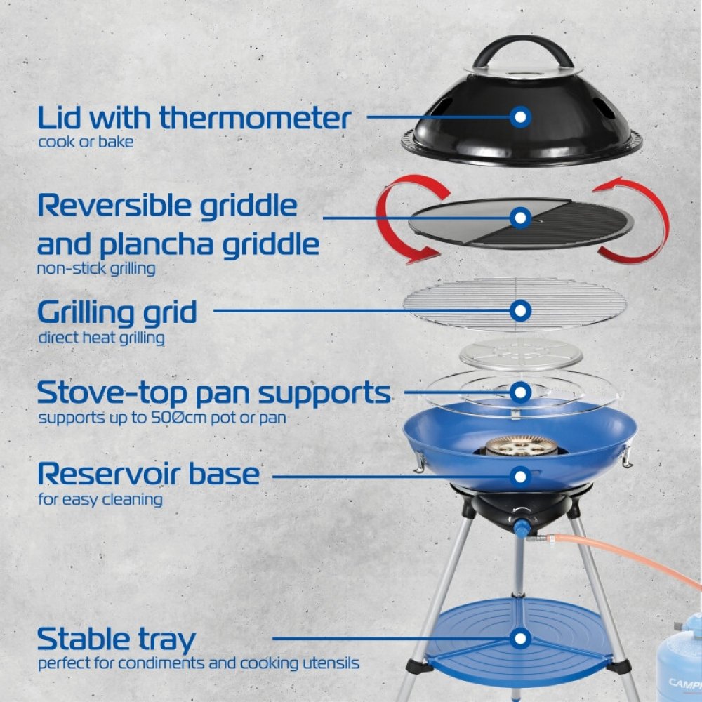 Disponuje nastavením na klasický vařič, nebo na gril a to díky smaltovanému grilovacímu roštu. Pro snadnější použití pracuje s plynovými kartušemi Campingaz® CV470 plus a CV300 plus. Vařte a grilujte vše co máte rádi na Party Grillu® a to díky jeho nekonečnému využití.