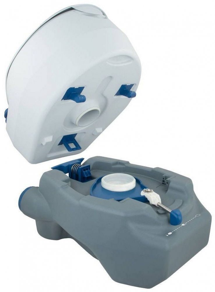 Chemická toaleta sestávající ze dvou snadno a rychle oddělitelných zásobníků. Horního pro vodu na splachování a spodního pro odpad. Antimicrobial prkénko + mísa odolávají plísním a eliminují pachy. Pro větší phodlí je sedací plocha zvýšena a má také rozšířené sezení. Extra silný spojovací zámek & pružinový systém. Madla vzadu a po stranách pro snadnou manipulaci. Vysoce kvalitní pístové čerpadlo.