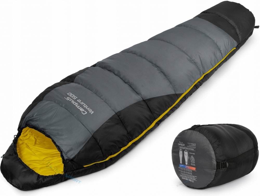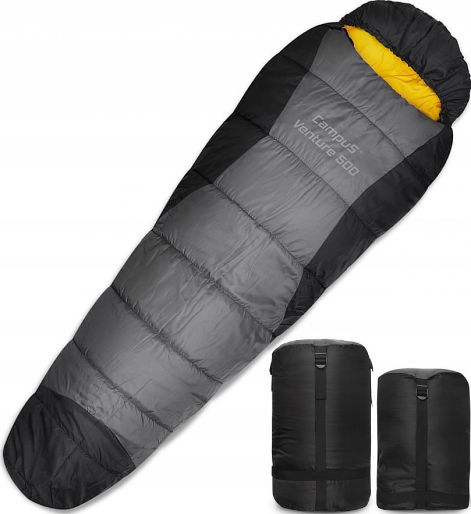 Teplý značkový spací pytel VENTURE 500 typu mumie od CAMPUS. Vyznačuje se velmi dobrými vlastnostmi, vysokou kvalitou zpracování a patentovanými technologiemi, jako je struktura výplně: HOLLOWFIBRE, moderní tkaniny: RIP-STOP. Díky tomu získává extrémy na úrovni až -17st. Spací pytel si po sbalení zachovává přijatelné velikosti (v. 39 x 27 cm), které lze navíc nastavit popruhy. Praktický potah má navíc kompresní popruhy: regulující a minimalizující objem sbaleného spacího pytle. Spací pytel nový, originální včetně sady visaček.