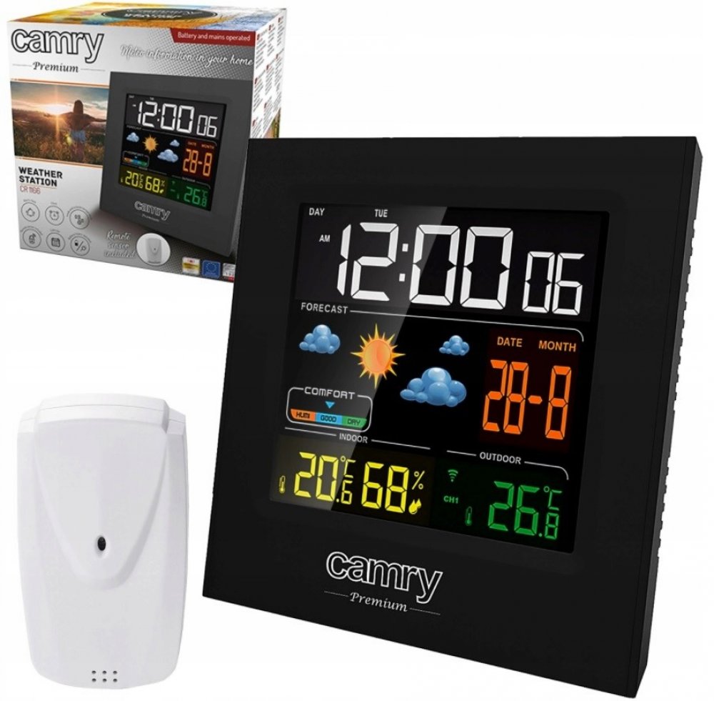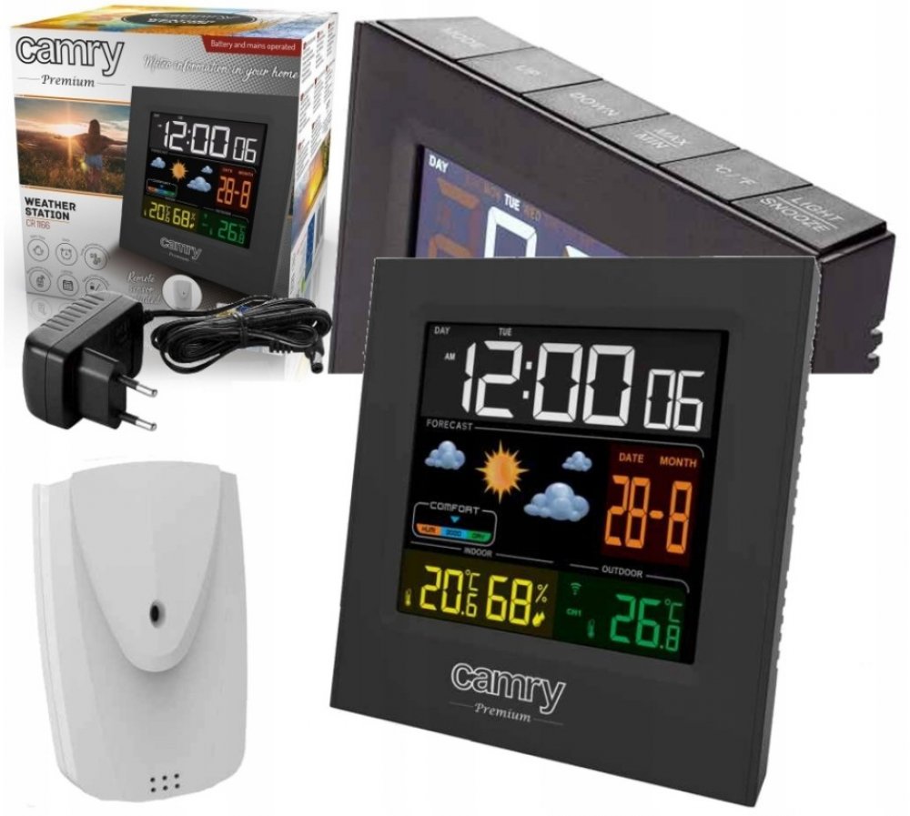 Multifunkční meteostanice s hodinami budíkem a externím senzorem Camry CR-1166 zobrazuje velké množství informací.