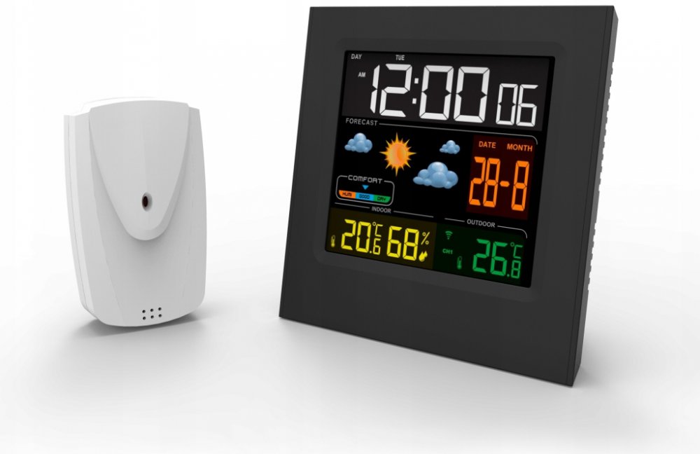 Barevný displej dále zobrazuje venkovní ( -20° - 60°C) i vnitřní teplotu (0°-50°C) s možností volby měření v ° C nebo ° F, Maximální a minimální teploty se zaznamenávají do paměti stanice.