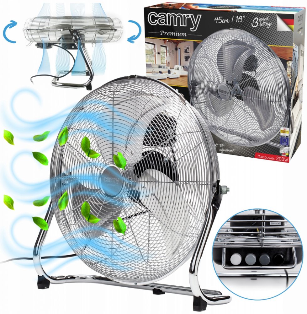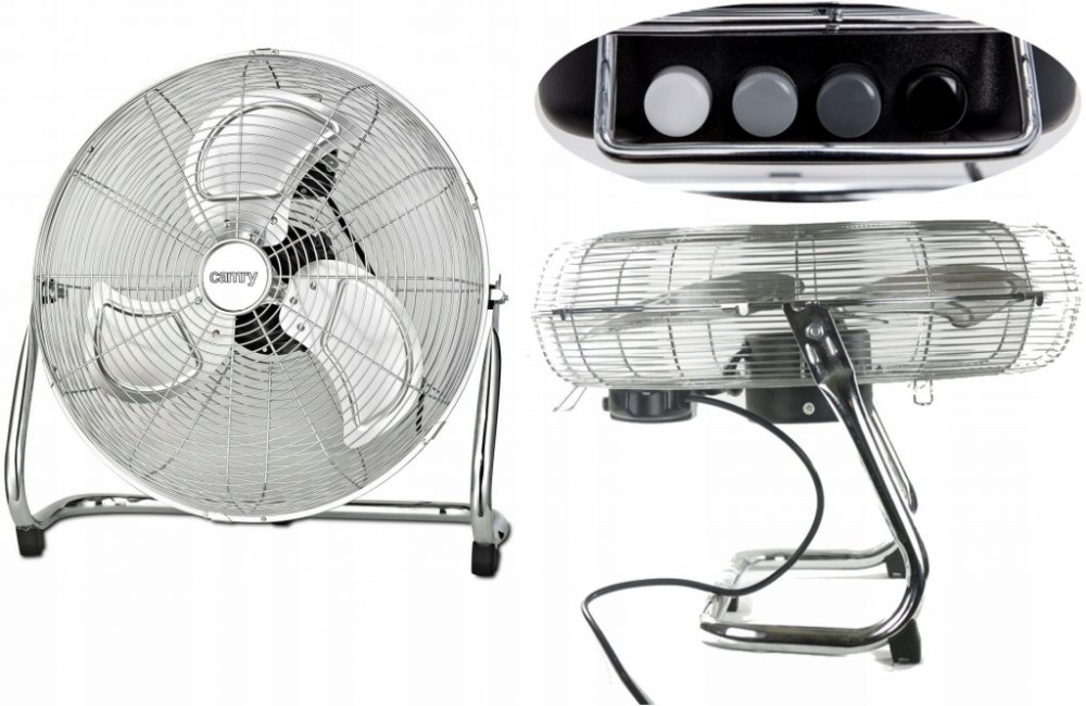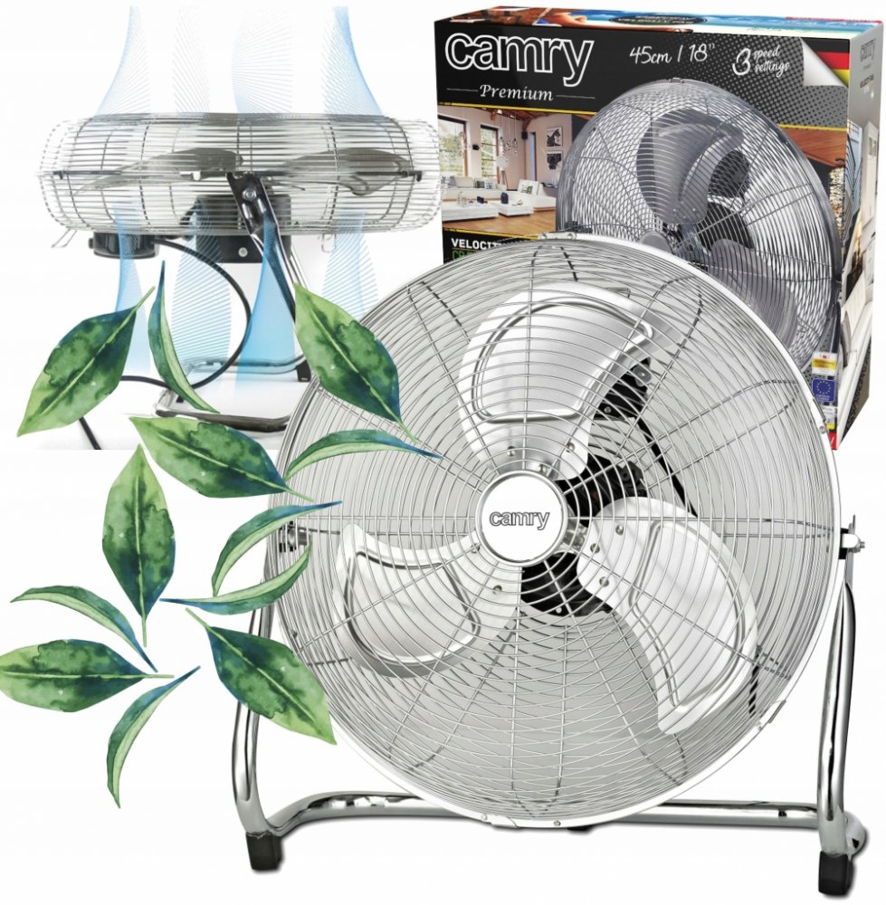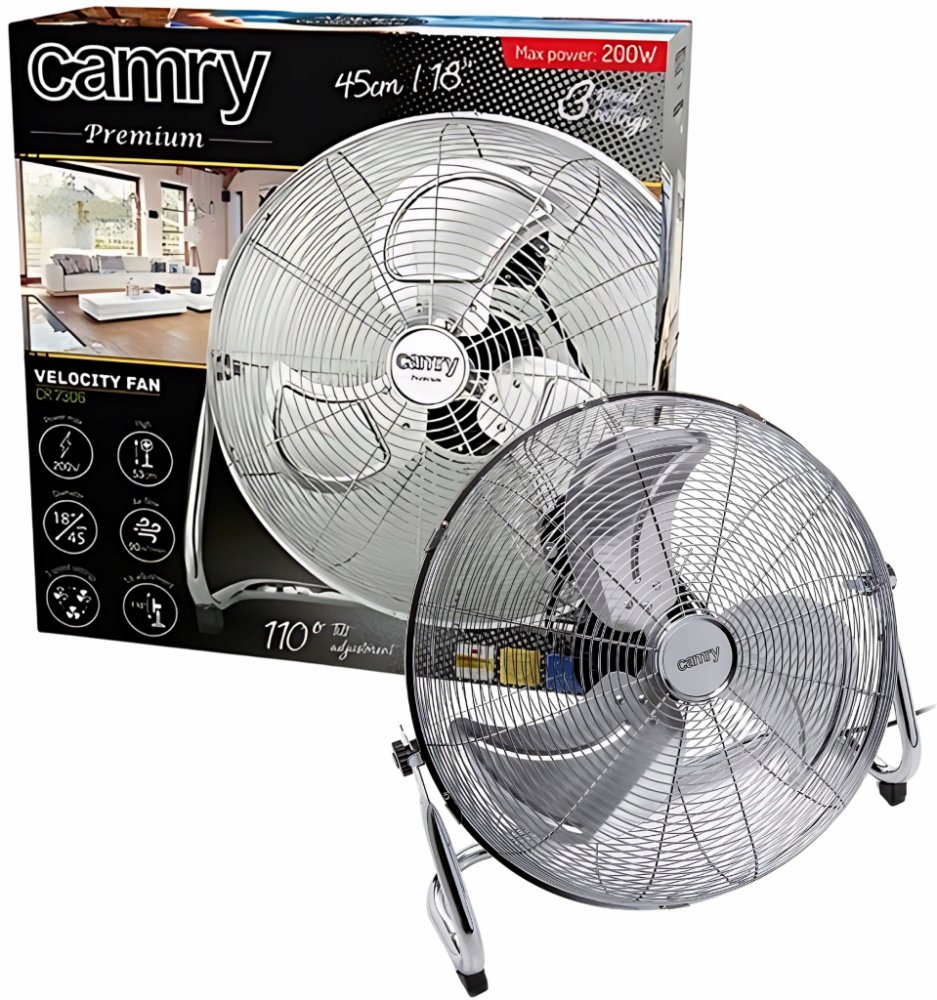 Podlahový vysokorychlostní ventilátor Camry CR 7306, průměr vrtule 45 cm, kovová vrtule, 3 rychlosti, nastevení úhlu, příkon 140 W