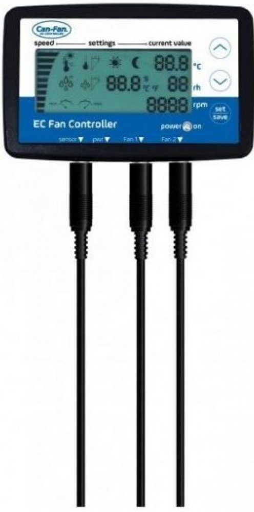 CAN představuje moderní LCD kontrolér pro EC ventilátory. Vyspělý systém pro řízení klimatu s LCD displejem, který umožňuje nastavit teplotu a vlhkost v kombinaci s dalšími důležitými funkcemi jako je hystereze, podtlak, maximální a minimální rychlost odtahových ventilátorů s EC motorem. Kontrolér pracuje pouze v kombinaci s odtahovými ventilátory CAN Fan s EC motorem. Je vybaven nejmodernější technologií, je energeticky účinnější a zaručuje vyšší výkon motoru a nižší spotřebu elektrické energie.