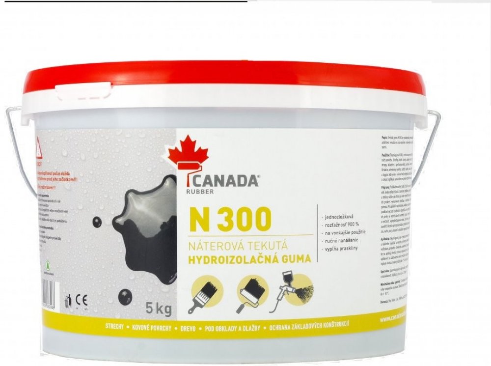 Opravovanou plochu zbavte prachu, mastnoty a nečistot. Před použitím Canada Rubber N300 je nutno použít penetrační nátěr (např. Canada Rubber P100). Canada Rubber N300 se nanáší na studený povrch pomocí štětce, válce nebo stříkací pistolí v nejméně dvou vrstvách, závisí na požadovaném efektu. Směr každé následující vrstvy má vést kolmo k předchozí, která musí být dokonale suchá. Přidáním výztuže (skleněná síťka) mezi vrstvy se zvyšuje hydroizolační odolnost. Canada Rubber N300 se nesmí používat při teplotách nižších než 5 °C. Nářadí ihned po použití očistit vodou. V případě zaschlého materiálu lze použít technický benzín.