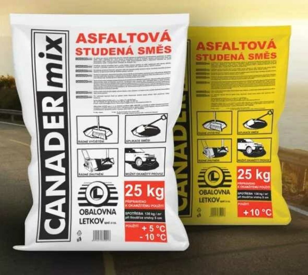 Studený asfalt CANADER‑mix umožňuje úsporné provádění výsprav výtluků a drobných oprav asfaltových povrchů i za nepříznivých povětrnostních podmínek, jako za deště, sněhu, náledí a mrazu v teplotách do -10 °C.