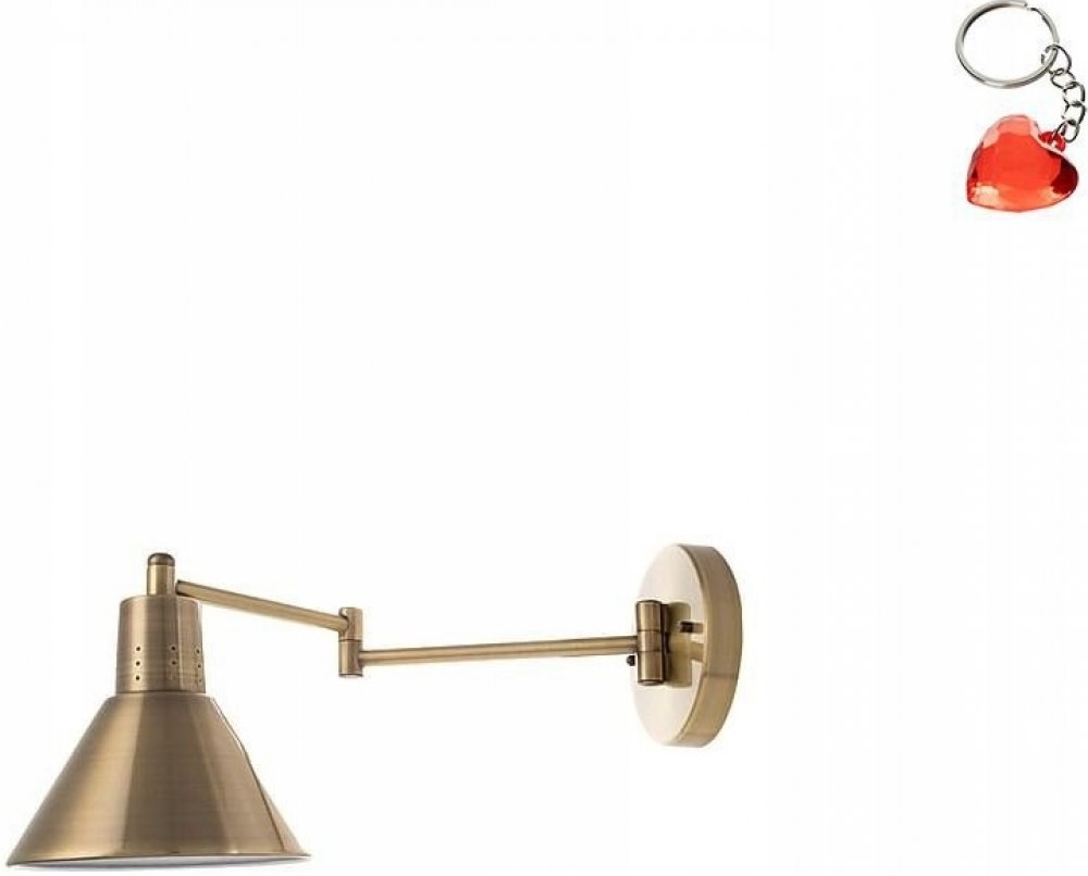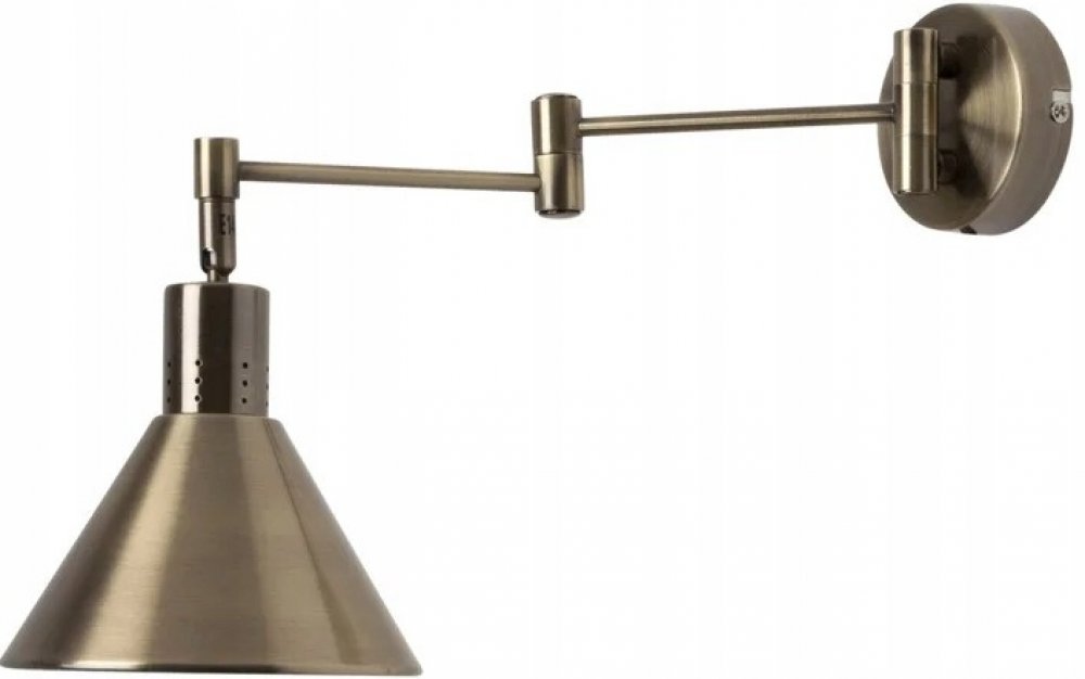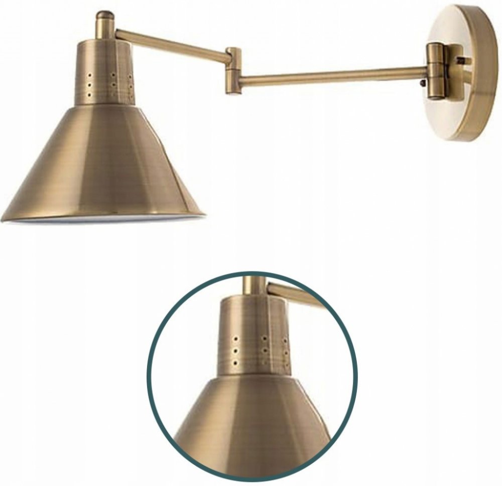 - montáž: na stěnu - napětí: 230V - zdroj světla: 1 - příkon žárovky: 1: 40W - závit žárovky: E14 - zdroj světla není součástí dodávky - výška stínidla: 8,5 cm - průměr stínidla: 14 cm - vzdálenost od stěny: vzdálenost od stěny: 37,5 cm - s nastavitelným ramenem - materiály: ocel, kov - barva: patina