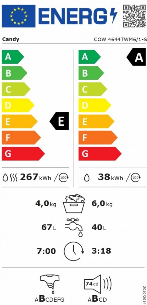 Candy COW 4644TWM6 1-S – Pračka se sušičkou Candy s možností propojení s chytrým telefonem a senzorovým sušením. 16 základních programů, maximální kapacita pro praní 6 kg a pro sušení 4 kg prádla.