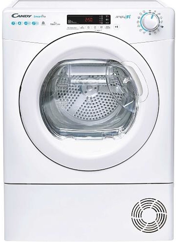 Candy volně stojící kondenzační 7 kg B pro 1–2 osoby s nádržkou na kondenzát pro technickou místnost (nad 65 dB) 67 dB 2.25 kWh 2.25 kWh A F otočný knoflík s tlačítky 85 cm 59.5 cm 46.5 cm 37.5 kg 14