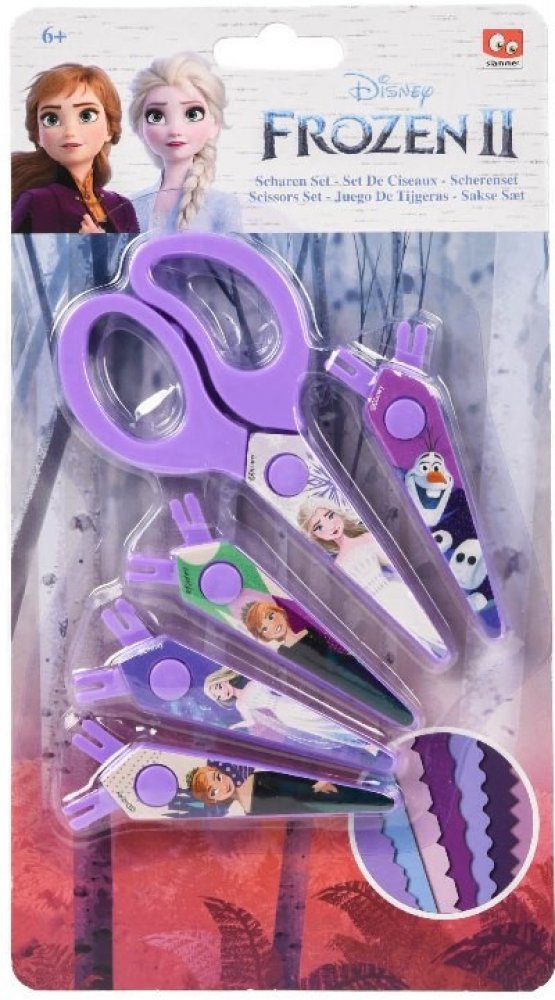 Dětské nůžky Frozen Ledové království s vyměnitelnými ZIG-ZAG čepelemi. Sada obsahuje celkem 5 vyměnitelných čepelí (4 "ZIG-ZAG" pro kreativní tvoření a 1 rovná). Délka cca. 13cm. Oficiální licence. Baleno na dárkovém blisteru.