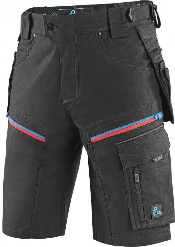 Pánské pracovní kraťasy CXS LEONIS – černé s modrými/červenými detaily a výztuhami CORDURA®. Odlehčené, ale odolné kraťasy CXS LEONIS jsou navrženy pro maximální pohodlí při práci v letních měsících.