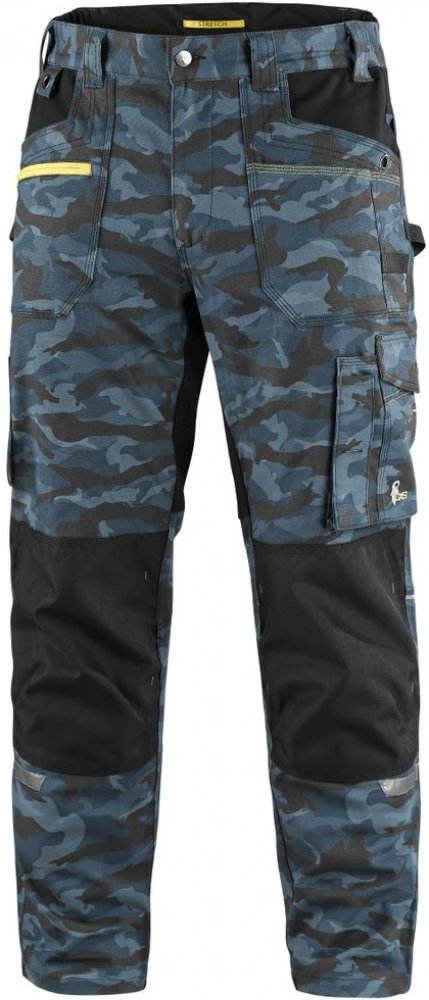 Pánské montérkové, strečové kalhoty CANIS CXS Kalhoty STRETCH maskáčové modré umožňující volný pohyb. Pas s poutky na opasek. Kolena zesílena 600D polyesterem s možností vložení kolenních výztuh. Zadní spodní lem nohavice vyztužen 600D polyesterem.