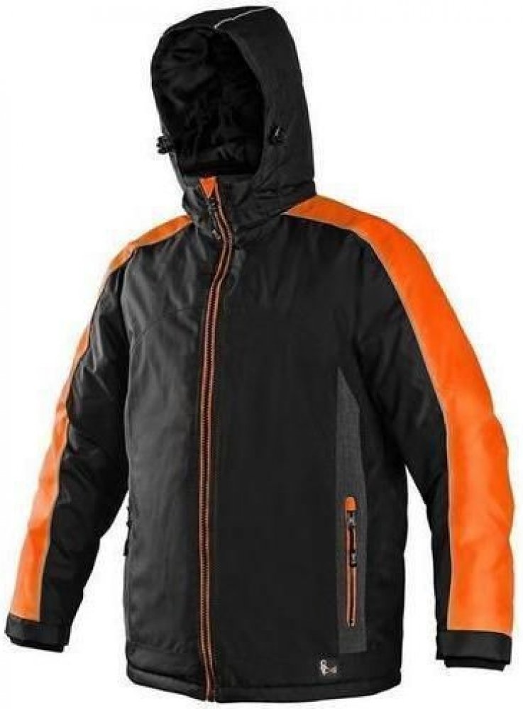 Černá pánská zateplená bunda s odepínací kapucí s oranžovými doplňky. Přední kapsy a vnitřní kapsa na zip. Pohodlnější nošení zajišťuje větrání v podpaží, zakončení rukávů pružnou manžetou a možnost stažení ve spodním okraji. Odolnost proti vodě, lepené švy. Zapínání na zip k bradě. Bezpečnost zvyšují reflexní prvky na rukávech a kapuci.velikost: S, M, L, XL, XXL, XXXL, XXXXLprovedení: pánskémater...