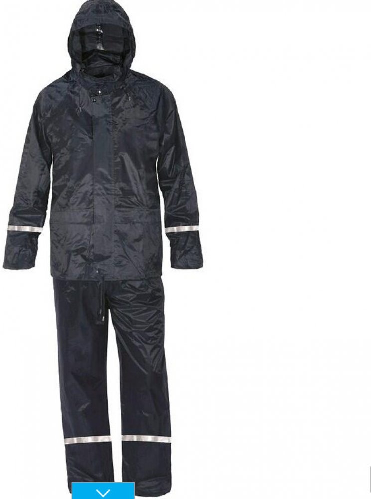 - Voděodolný oblek, kalhoty v pase do gumy, blůza 3/4 s kapucí v límci a zapínáním na zip