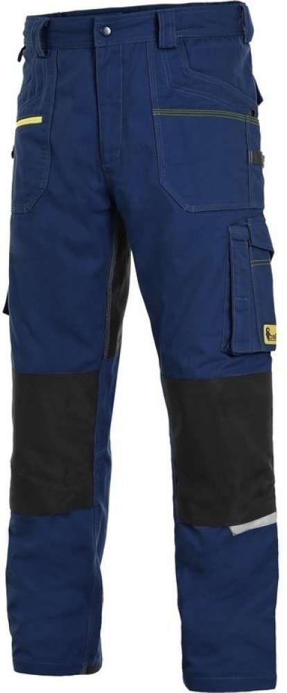 Pánské montérkové kalhoty, strečová tkanina umožňující volný pohyb, pas s poutky na opasek, speciální zasouvací patent v pase proti samovolnému rozepnutí, přední kapsy s kapsou na zip, multifunkční kapsy na obou stranách, kolena zesílena 600D polyesterem s možností vložení kolenních výztuh, dvě zadní kapy - jedna s klopou, zadní spodní lem nohavice vyztužen 600D polyesterem, reflexní doplňky. Materiál: 98% bavlna 2% elastan, 250g/m2. Doporučené použití: např. strojírenství, stavebnictví, lehký průmysl, automobilový průmysl, zemědělství, hobby, atd.. Barva tmavě modrá-černá. Velikost: 46-64.