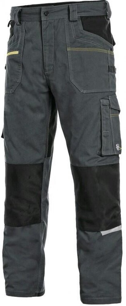 Pánské montérkové kalhoty, strečová tkanina umožňující volný pohyb, pas s poutky na opasek, přední kapsy s kapsou na zip, multifunkční kapsy na obou stranách, kolena zesílena 600D polyesterem s možností vložení kolenních výztuh, dvě zadní kapsy - jedna s klopou, zadní spodní lem nohavice vyztužen 600D polyesterem, reflexní doplňky. Doporučené použití: strojírenství, stavebnictví, lehký průmysl, automobilový průmysl, logistika, skladová manipulace, spedice, autoservisy, údržba, montáže, zemědělství, zahrada, hobby. Materiál 98% bavlna 2% elastan. Gramáž 250 g/m2. Norma EN ISO 13688. Typy barevného provedení: tmavě modro-černá, šedo-černá, tmavě šedo-černá, modro-černá, béžovo-černá, bílo-šedá, červeno-černá. Velikost: 46-64. Barva modro-černá a šedo-černá i ve velikosti 66 a 68.