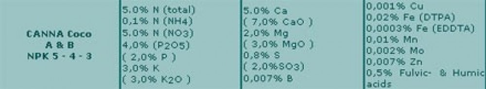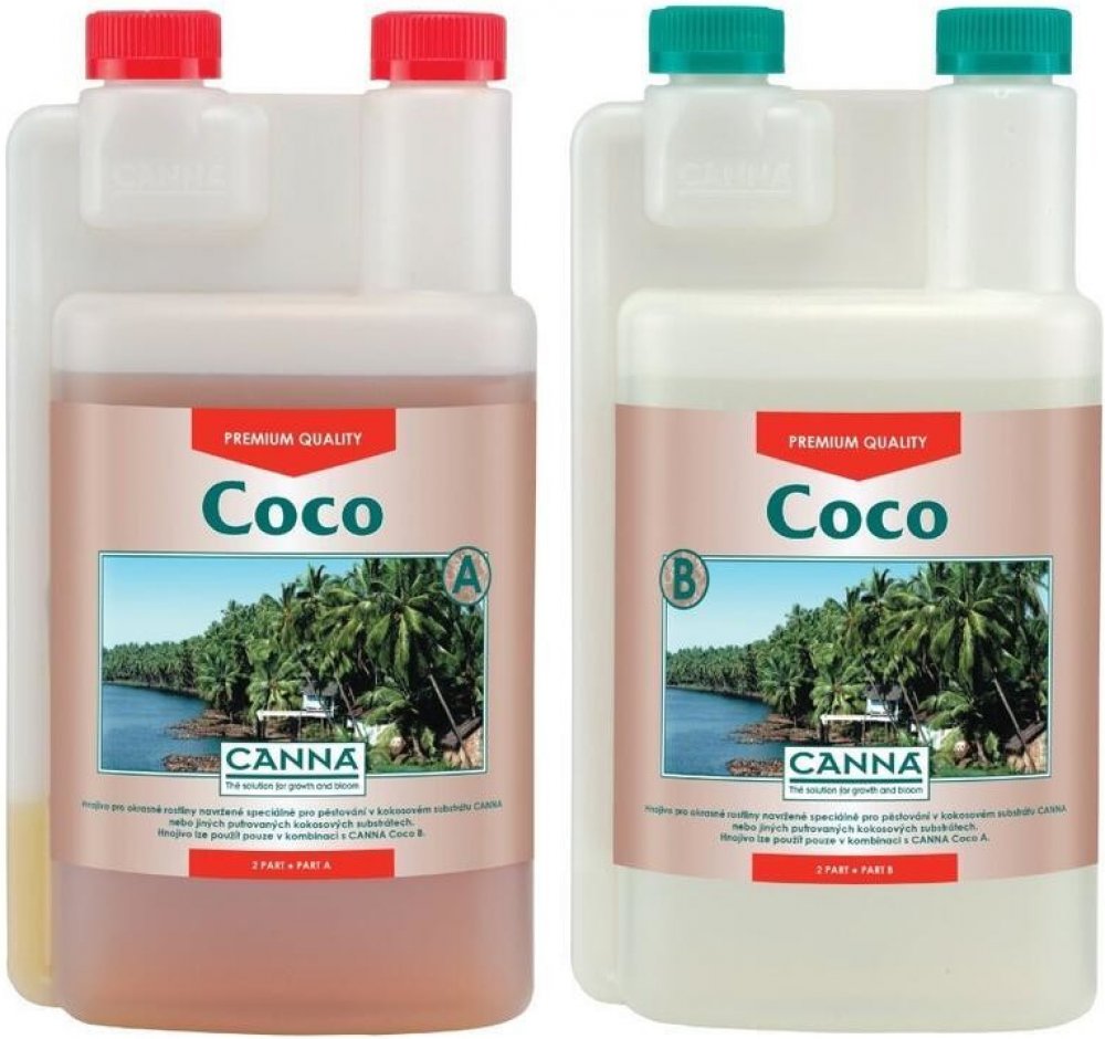 Po letech zkoumání zeminy, odvodňování a analýzy listů, CANNA uspěla v tom, být první vyvinout hnojivo, které je specificky přizpůsobené charakteristikám kokosového substrátu. Pěstitelé po celém světě jsou celé roky nadšení z explozivního růstu a vydatného kvetení pomocí produktu CANNA Coco. Díky vyrovnávacím kvalitám produktu CANNA Coco A&B se používá jak pro fázi růstu, tak pro fázi květu.