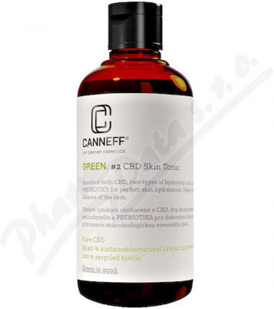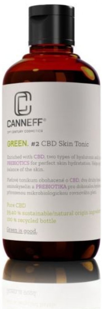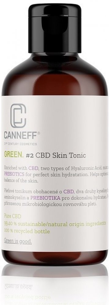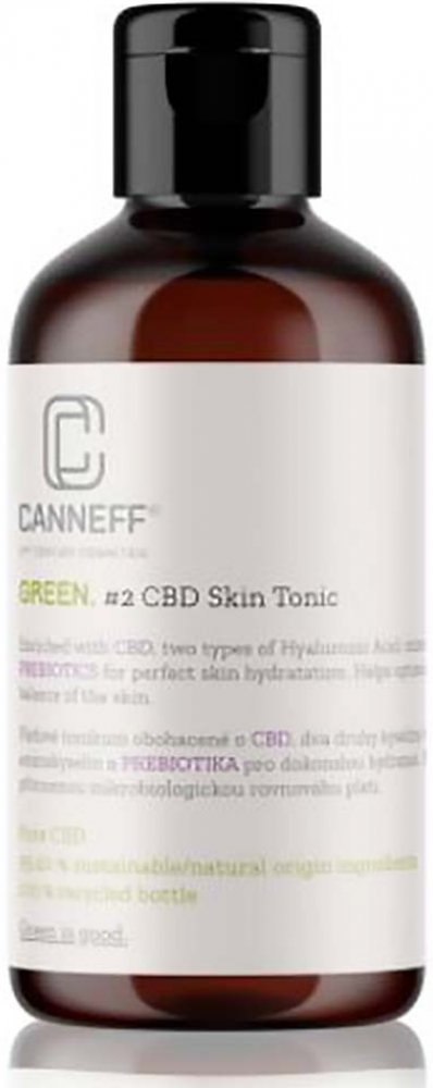 Canneff Green #2 CBD Skin Tonic obsahuje dva druhy kyseliny hyaluronové, CBD, směs aminokyselin a prebiotika. Dodá pleti dokonalou hydrataci a optimalizuje přirozený mikrobiom pokožky