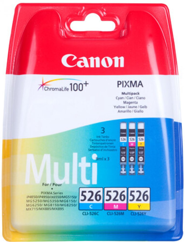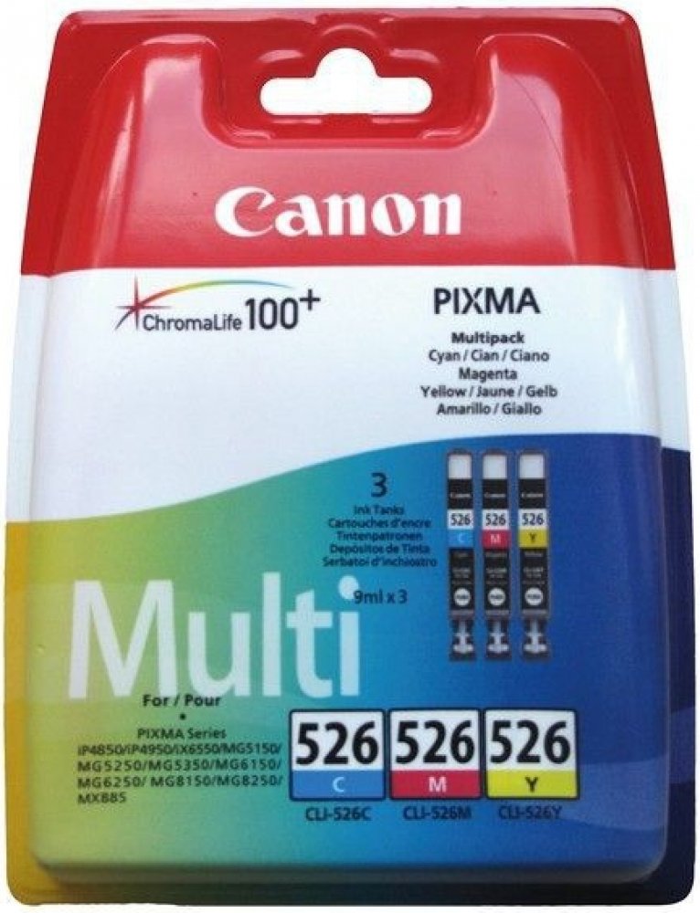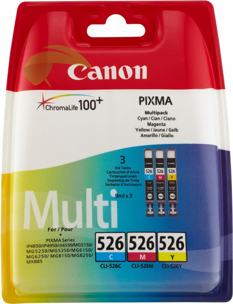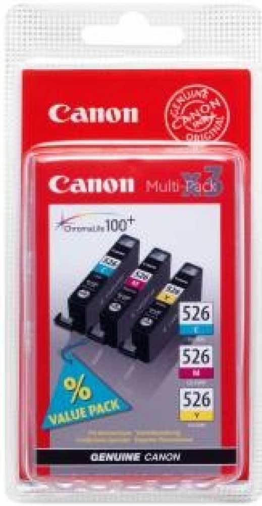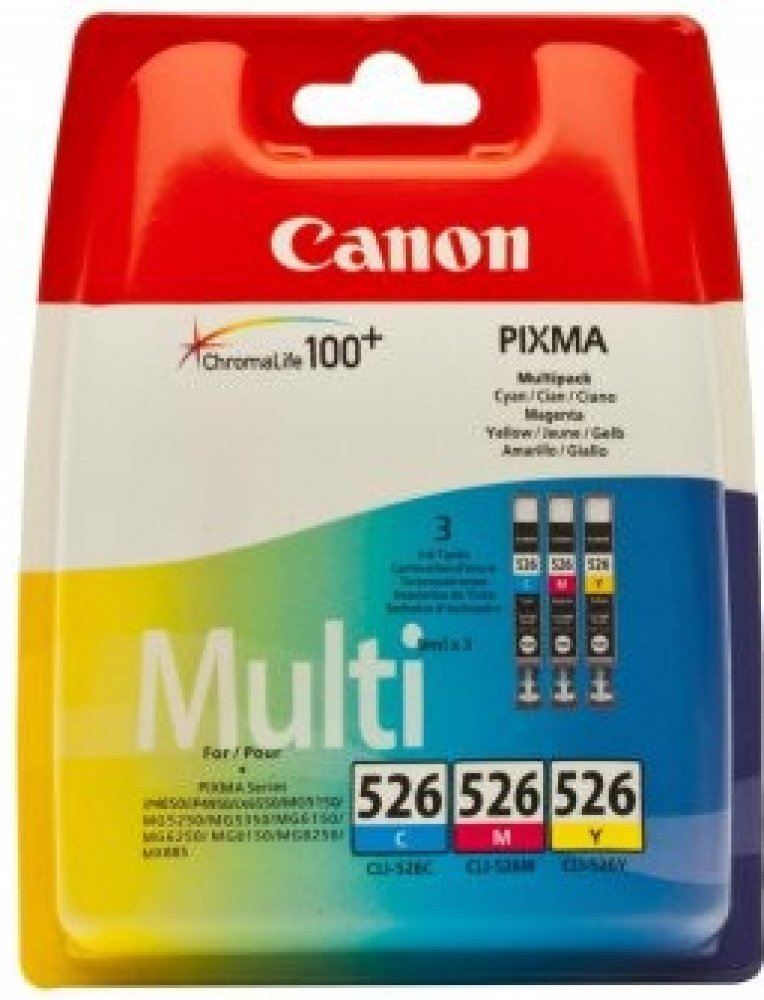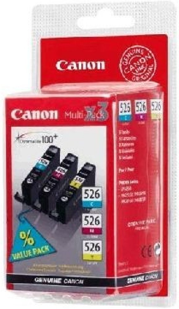Společnost Canon se již dlouhou dobu zabývá výrobou kvalitních laserových a inkoustových tiskáren společně s potřebným příslušenstvím. V tiskárnách a multifunkčních zařízeních najdete nové a pokrokové technologie, které vylepšují kvalitu tisku, životnost tiskáren a rychlost tištěných stránek. Canon CLI-526 C/M/Y Pack je náhradní set náplní od společnosti Canon, který obsahuje červenou, modrou a žlutou barvu pro tiskárny Canon Pixma MG5150, MG5250 a MG8150 téže firmy. Sety jsou výhodné hlavně nižší cenou, než za jakou by jste koupili tyto tři cartridge samostatně. Po otevření setu, doplníte pouze barvu, která Vám aktuálně došla a zbylé náplně budete mít připravené na příště. Vzhledem k odděleným zásobníkům, které jsou každý zvlášť zabaleny proti vysychání se nemusíte bát, že by Vám nějaká z náhradních barev zaschla pokud neporušíte její ochranný obal. Výhodou originální cartridge je 100% kompatibilita s produkty a maximální kvalita tisku, kterou nelze s neoriginálními náplněmi dosáhnout.