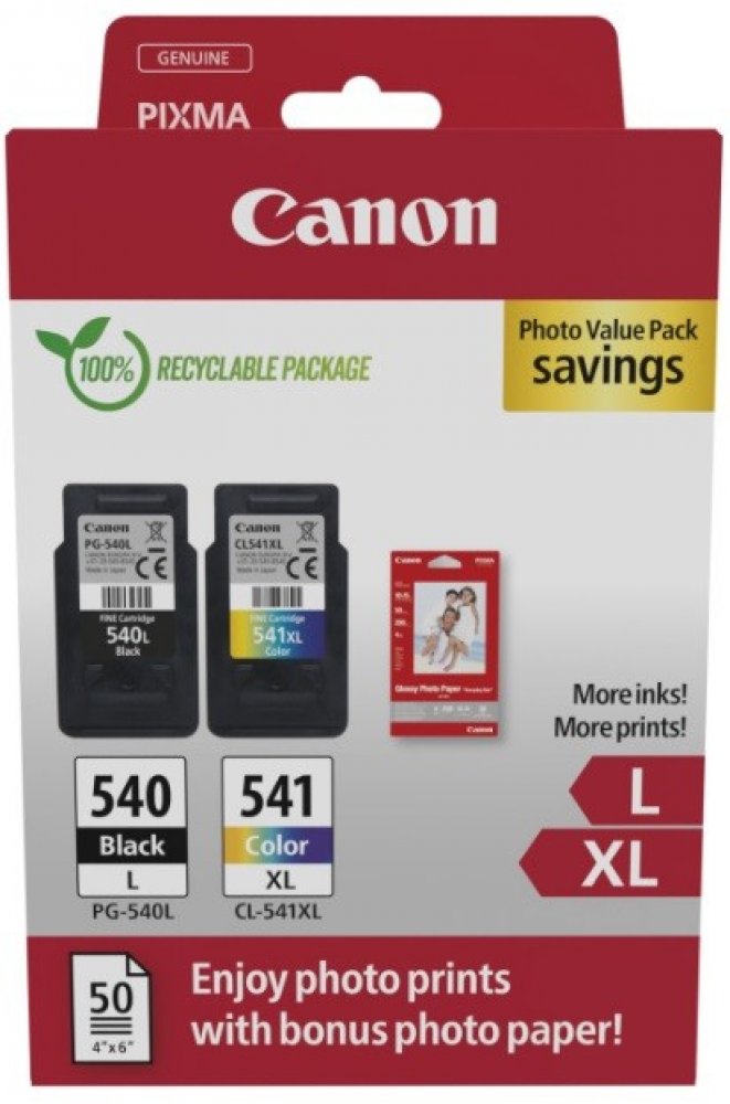 Canon PG-540L/CL-541XL Ink cartridge PVP, černá (black) + barevná (colour) + fotopapír, výtěžnost 300 str. černá, 400 str. barevná Kompatibilní s Pixma: MX475