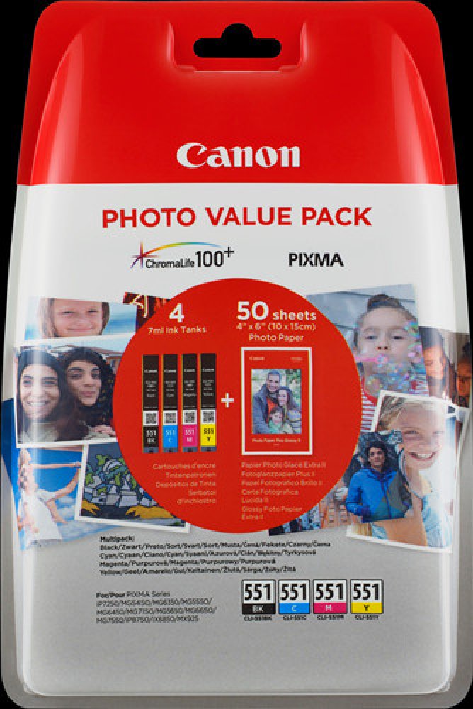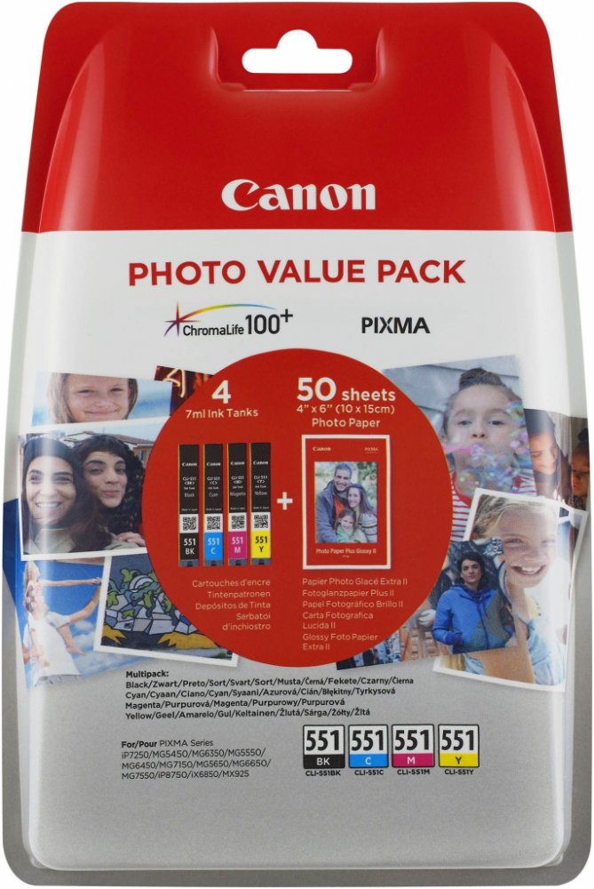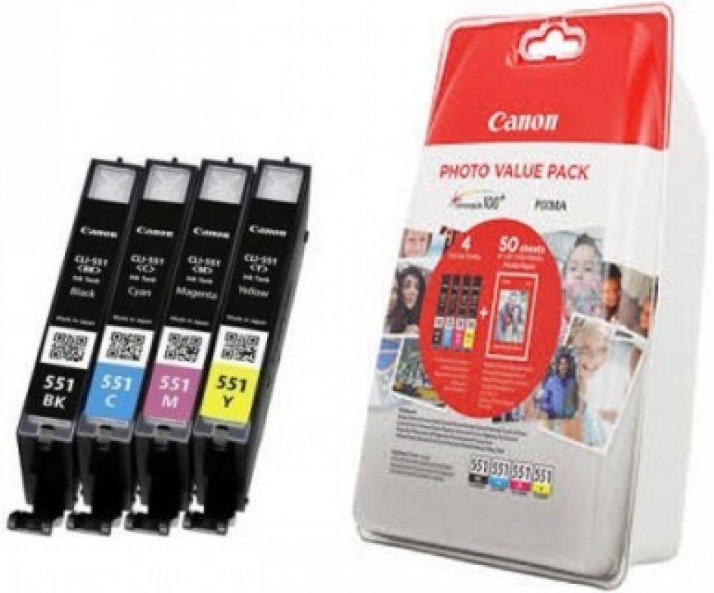 Sada originálních inkoustů Canon CLI-551 Podrobný popis:Canon CLI-551 multipack (CMYK) + PP-201 fotopapír 50x, foto papír, lesklý, bílý, 10x15cm, 4x6", 6508B005