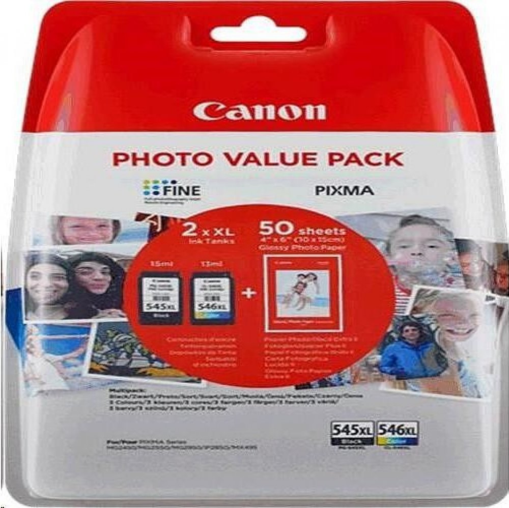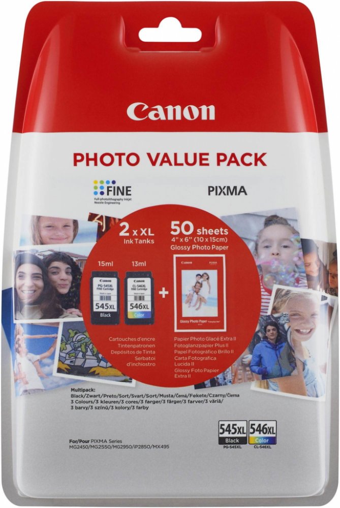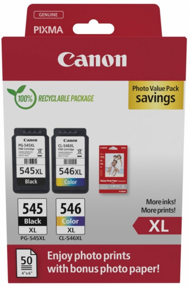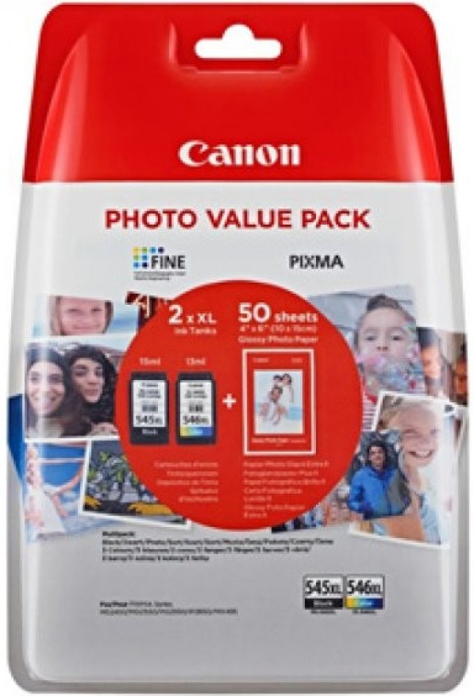 Canon CARTRIDGE PG-545XL/CL-546XL-fotopapír GP 501 multipack pro Pixma MG a Pixma TS 305, 3150, 3151, 3450, 3451, 3452, 2550, 2550s, 2555, 2555s, 3050, 3051, 3052 a 3053 (400 str.)Cartridge Canon do inkoustové tiskárny Canon Pixma MG a Pixma TS je tou pravou volbou jako stvořenou přímo pro všední komerční tisk důležitých textů a jiných dokumentů. Poskytuje perfektní tisk s dlouhou trvanlivostí. Výtěžnost je celkem 400 potištěných stran. V praktickém multipacku naleznete více barev, obsaženy jsou azurová, černá, purpurová a žlutá. Tiskněte levně a chytře s cartridgí pro tiskárny Canon PG-545XL + CL-546XL + fotopapír GP-501 Multipack, která je ušita vaší tiskárně Canon přímo na míru. Do jejích hlavních výhod se řadí plná kompatibilita a stoprocentní bezpečnost, kterou ocení jak příležitostný, tak také náročný uživatel. .