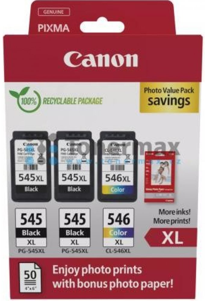 Originální cartridge Canon PG-545XL + PG-545XL + CL-546XL + 50 x Photo Paper 10x15 cm, 8286B015, 8286B016, barva černá / černá / tříbarevná (black / black / color), výtěžnost 2 x 15 ml / 13 ml. Pro tiskárny Canon PIXMA MG2450, PIXMA MG2455, PIXMA MG2550, PIXMA MG2550S, PIXMA MG2551S, PIXMA MG2555, PIXMA MG2555S, PIXMA MG2556S, PIXMA MG2950, PIXMA MG2950s, PIXMA MG2955, PIXMA MG3050, PIXMA MG3051, ...