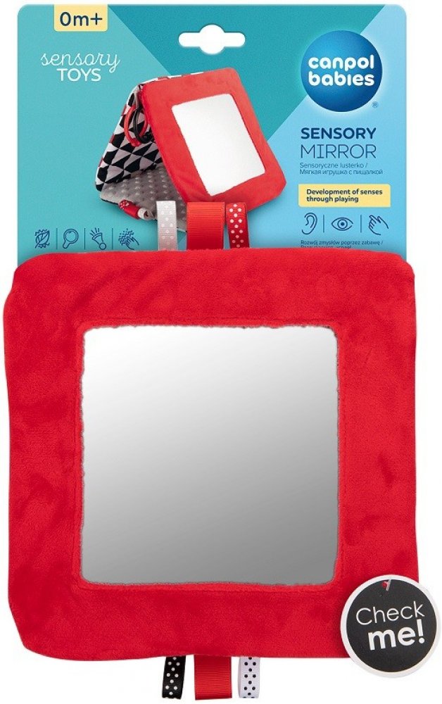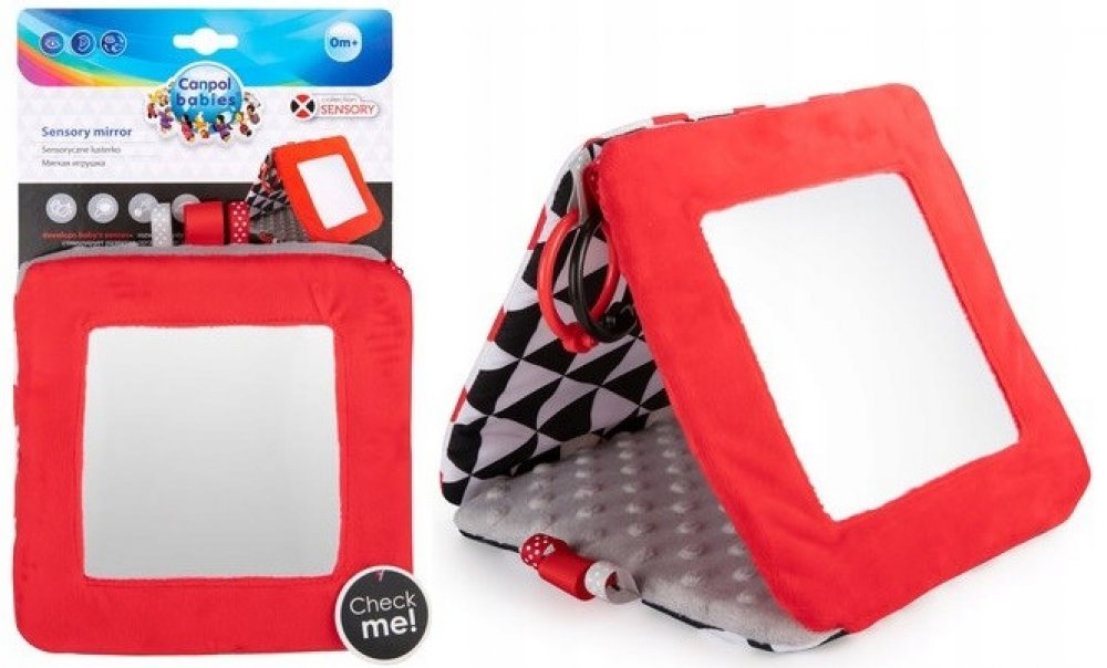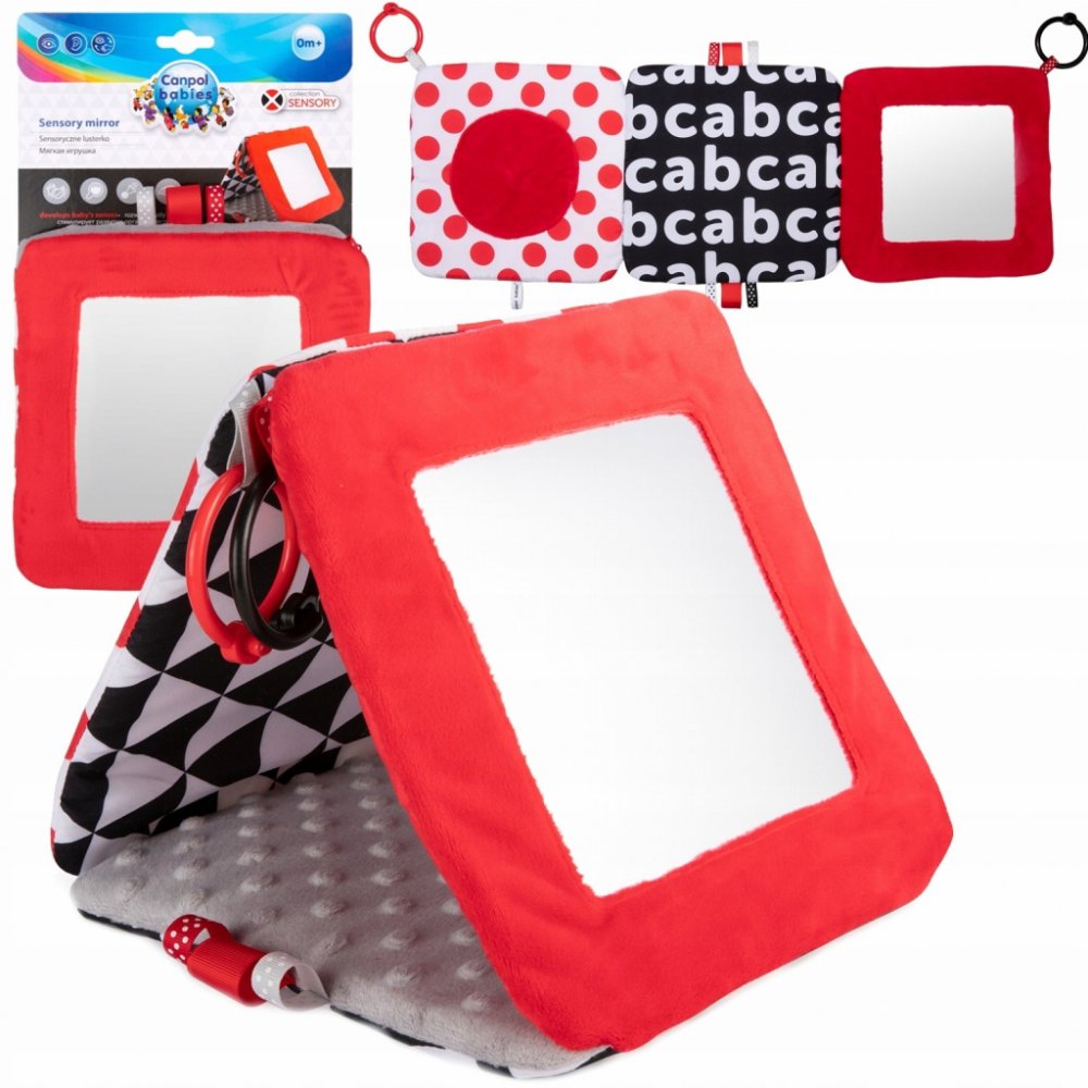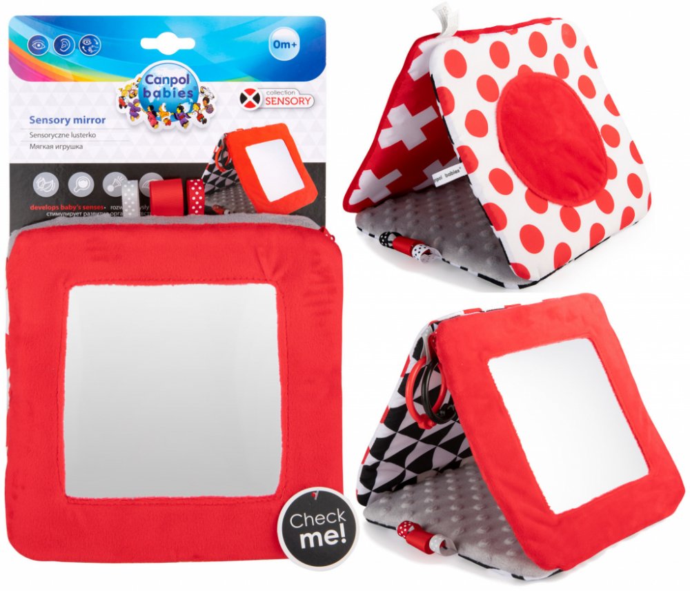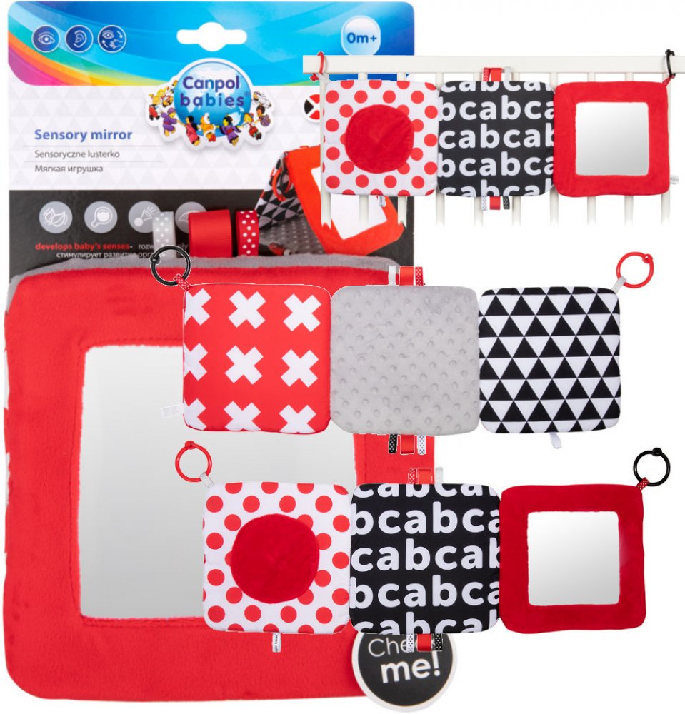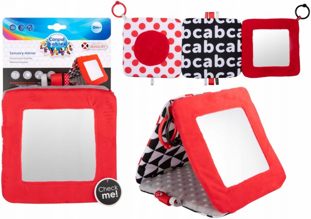 Kontrastní závěsné zrcadlo z kolekce SENSORY je určeno již pro nejmenší děti. Hračku je možné jednoduše upevnit na požadované místo - kočárek, postýlku nebo autosedačku, ale i jednoduše skládat do tvaru pyramidy nebo rozkládat do tvaru knížky. Praktický doplněk disponuje šustícími a pískacími elementy a zrcátkem. Senzorické barvy a různé textury materiálů stimulují rozvoj smyslů dítěte.