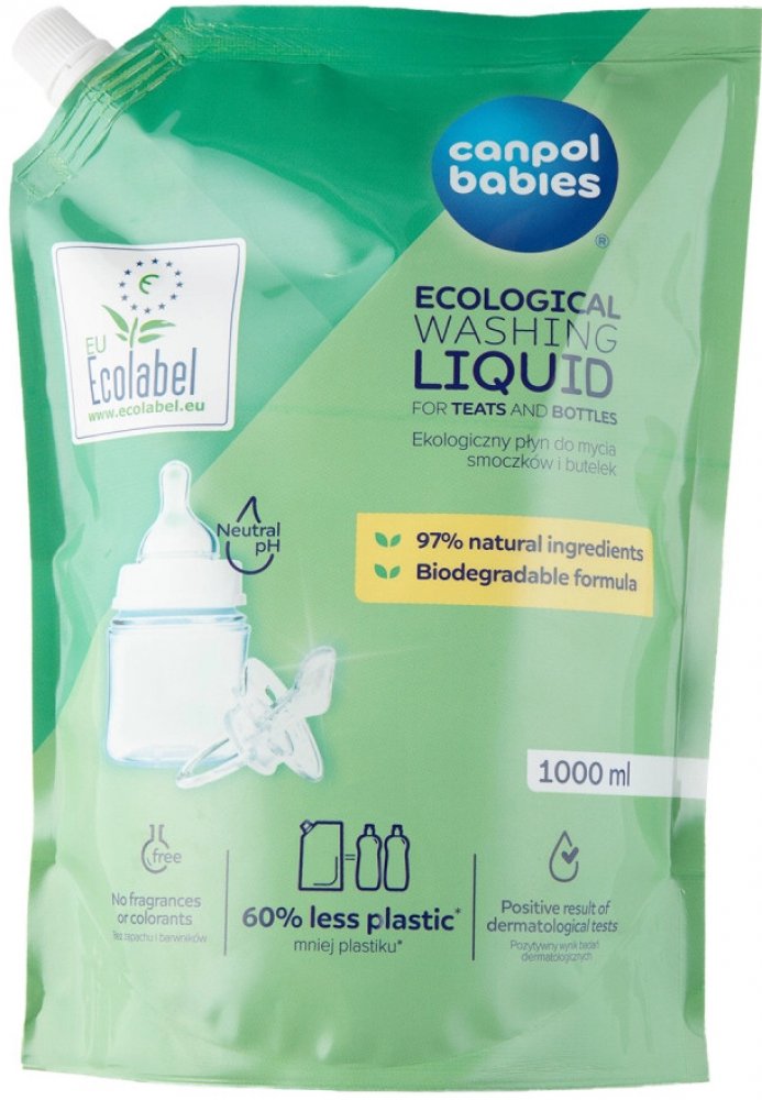 Ekologický mycí prostředek na kojenecké lahve a savičky byl vyroben s ohledem na zdraví a bezpečnost dítěte. Je hypoalergenní, bezbarvý a obsahuje 97% přírodních složek. Účinně odstraňuje veškeré zbytky mléka, džusů, kaší a potravin. Perfektně se oplachuje. Mycí prostředek je jemný k rukám, má neutrální pH pro pokožku a byl dermatologicky testován. K účinnému vyčištění kojeneckého příslušenství, jako jsou lahve, dudlíky, dudlíky, dětské nádobí, hračky a části odsávačky mléka, stačí malé množství mycího prostředku. Canpol babies Ekologický mycí prostředek na kojenecké lahve a savičky je certifikován ekoznačkou EU – oficiální evropskou značkou udělovanou produktům, které jsou šetrné k životnímu prostředí a které splňují vysoké kvalitativní a zdravotní standardy: PL/019/009.