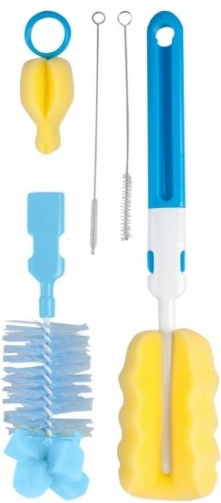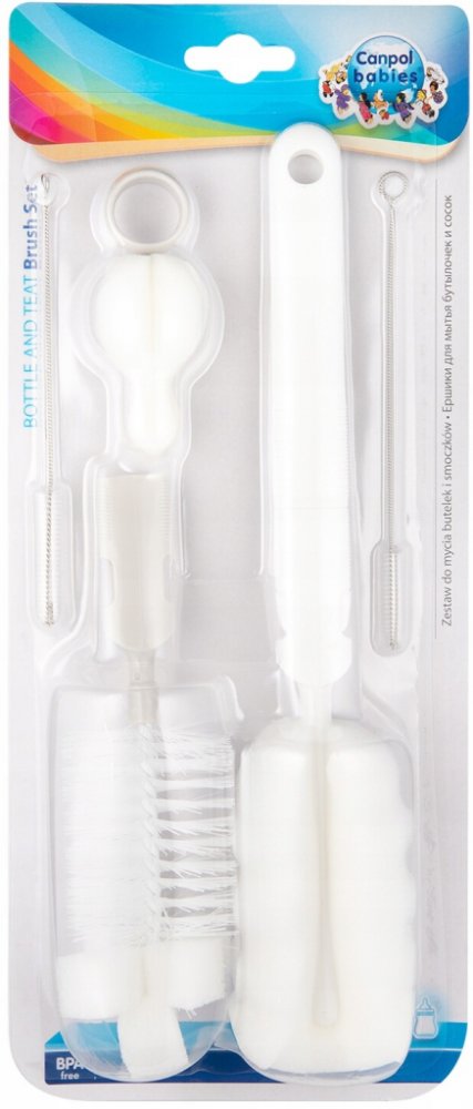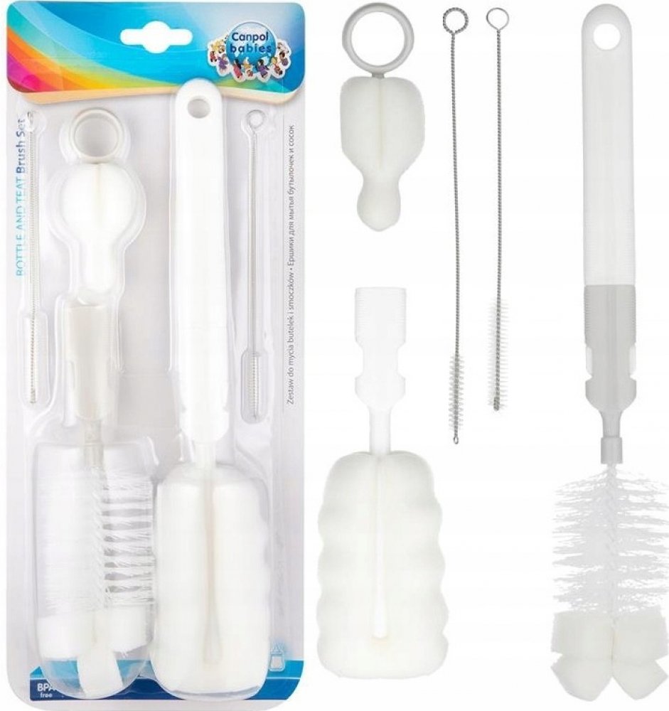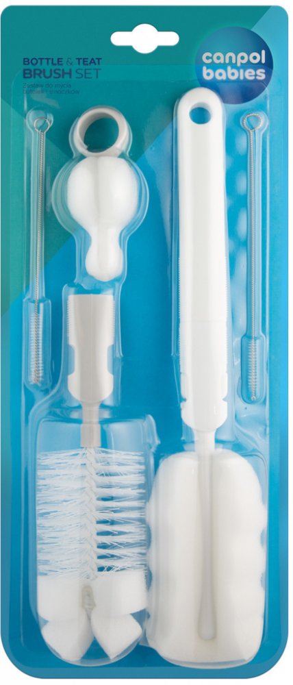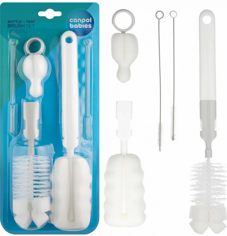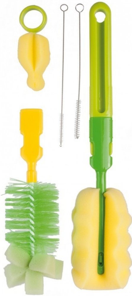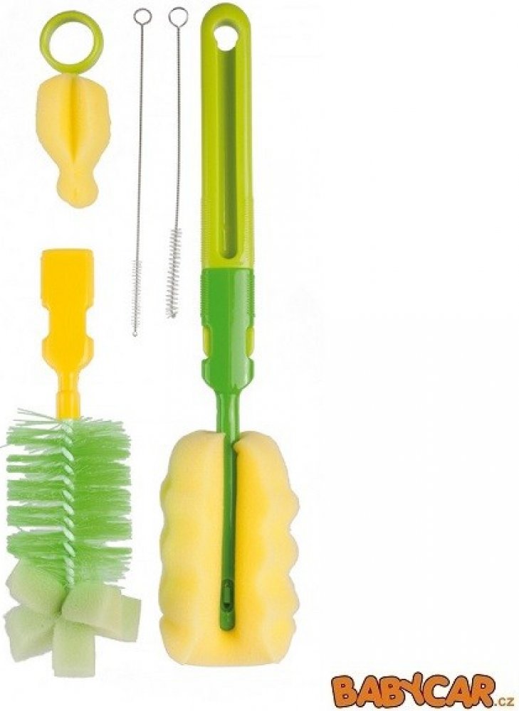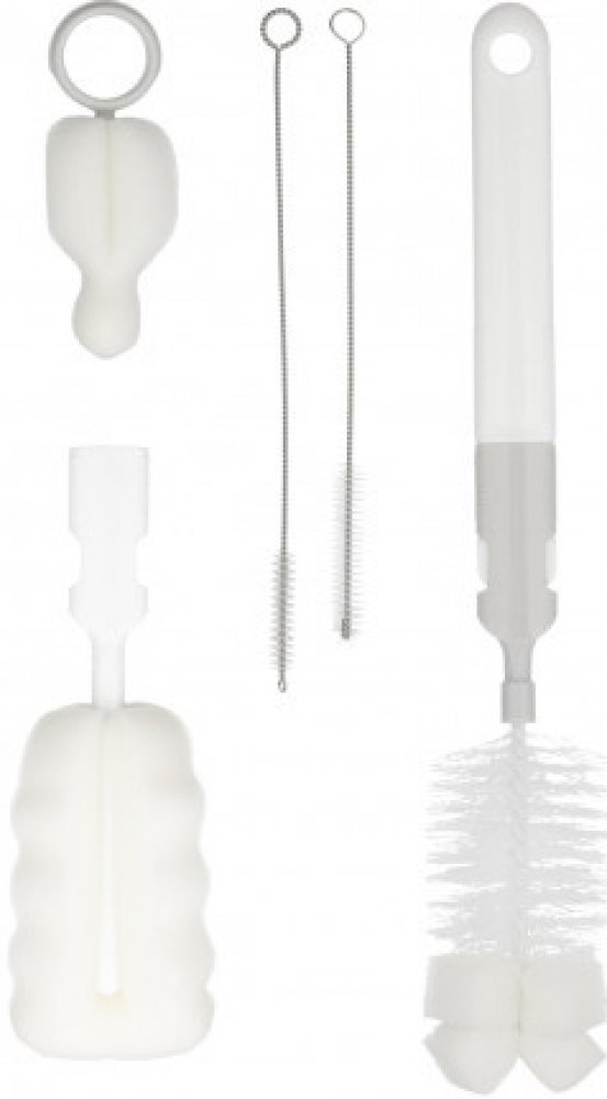 Sada kartáčů k bezpečnému čištění láhví a dudlíků před jejich sterilizací. Sada obsahuje kartáč s hubkou, pěnový kartáč, pěnový kartáček na dudlíky a dva malé kartáčky.