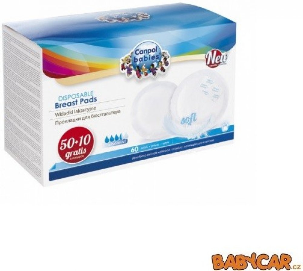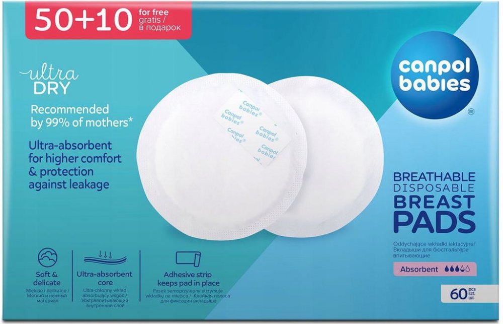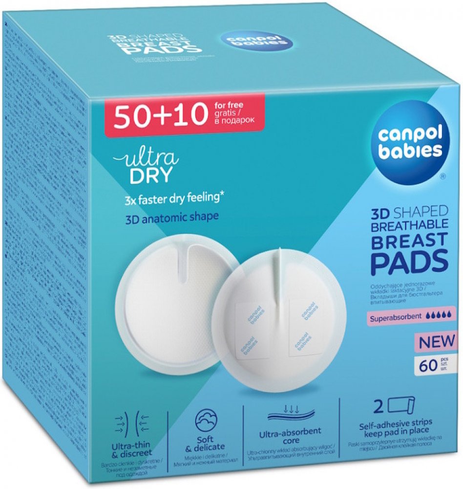 Praktické jednorázové tampóny do podprsenky Canpol babies nedráždí citlivou pokožku prsu ani bradavky. Měkká absorpční vrstva zadržuje vytékající mléko a nepropustná vnější vrstva zabraňuje ušpinění prádla. Samolepící páska pomáhá fixovat tampón na správném místě. Tampóny se výborně přizpůsobí tvaru prsu a jejich použití je velmi diskrétní. Dodávají se v balení po 50 + 10 kusů zdarma.