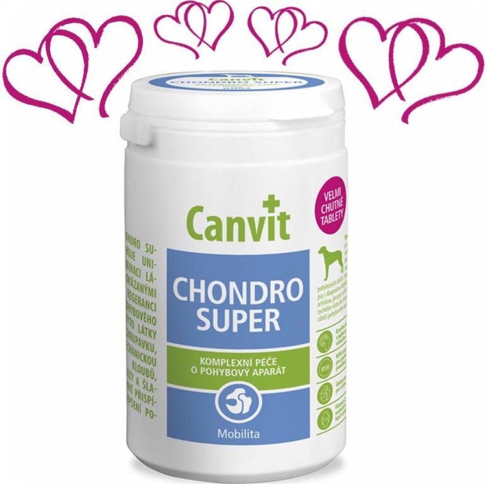 Psí chrupavky se postupně opotřebovávají a je potřeba je regenerovat. Pravidelné užívání tablet zpomaluje opotřebení chrupavek a regeneruje je. MSM (vázaná síra) a kyselina hyaluronová má silné protizánětlivé účinky, díky kterým je u pejska potlačena bolestivost kloubů. Canvit Chondro Super příjemně voní a chutná po játrech (kuřecí a vepřová játra), proto je přípravek Chondro Super všemi psy dobře přijímán.