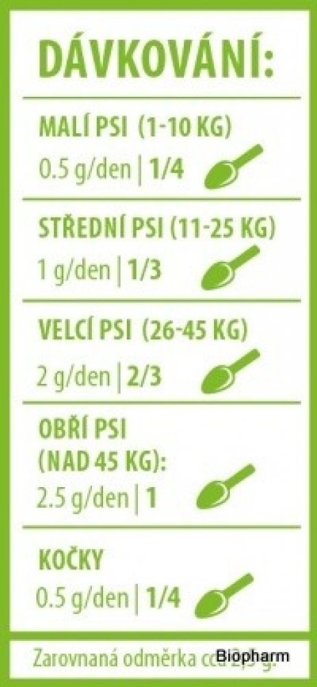 Dávkování: na 10 kg psa: 1/4 lžičky denně