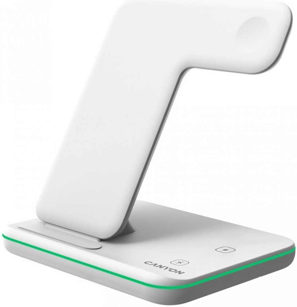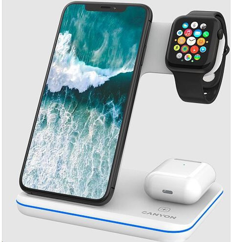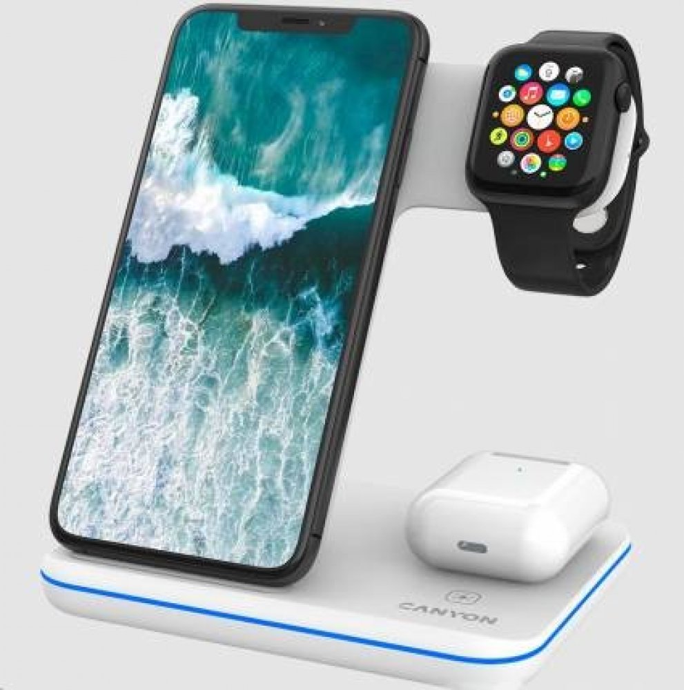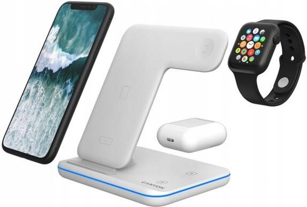 bezdrátová nabíjecí stanice podporující QI; nabíjí 3 zařízení současně; čipová sada Nuvoton; protiskluzová pogumovaná základna; dotykové tlačítko pro ovládání podsvícení; LED indikátor a podsvícení; 4 typy ochrany; kabel USB-C 1,2 m součástí balení; kompatibilní s Apple Watch / iPhone / Airpods