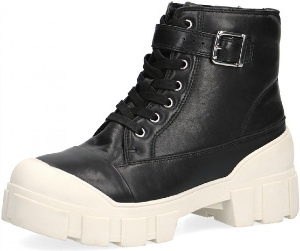 Dámské kožené kotníkové boty černé barvy. Nazouvání zpříjemňuje zapínání na zip a klasické šněrování, přes které je v horní části rozepínací pásek