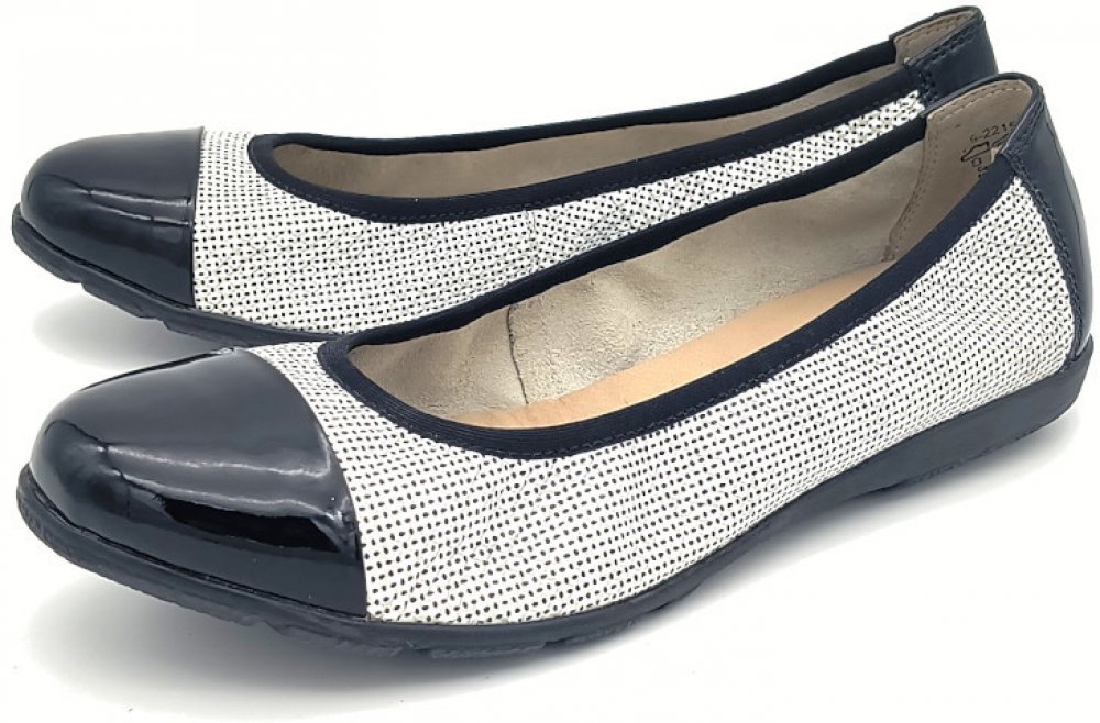 Dámské balerínky Caprice vynikají špičkou a opatkem v černém lesku, zbytek svršku je v bílé s kárem a černými tečkami. Jsou v komfortním provedení, kde svršek je z kvalitní měkké kůže a stélka je s funkcí on Air Insole, která změkčuje došlap a zajišťuje dobrou regulaci klimatu chodidla. Podešev je velice flexibilní.
