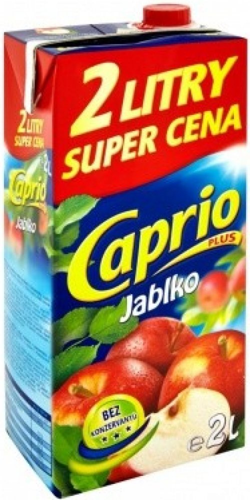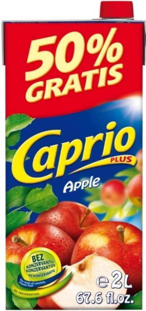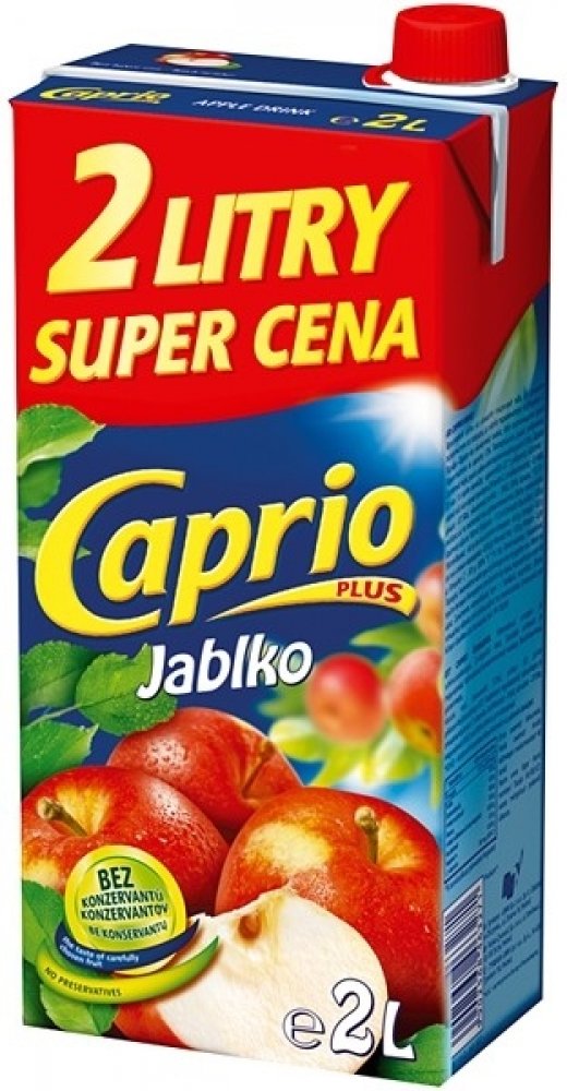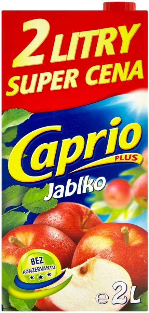 Bez konzervantů, Nejlepší k jídlu, Naše ovocné nápoje Caprio v balení 2L jsou vhodné pro každého, kdo ocení lahodné nápoje za příznivou cenu. Nápoj je bez konzervantů. , Nesycený jablkový nápoj vyrobený z koncentrátu, s cukry a sladidly, Obohaceno o vitamin C. Pasterizováno.Podíl ovocné šťávy: 4%.,