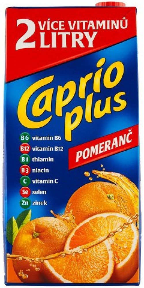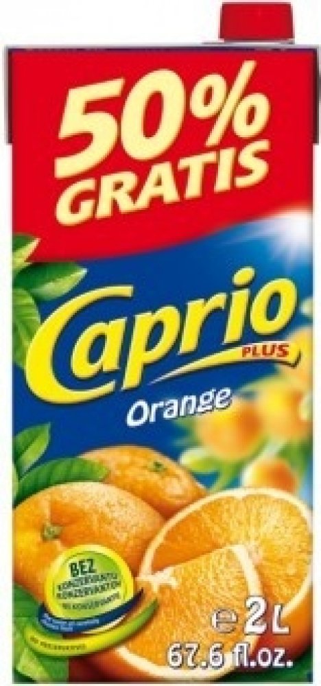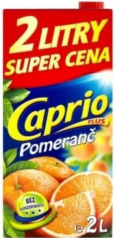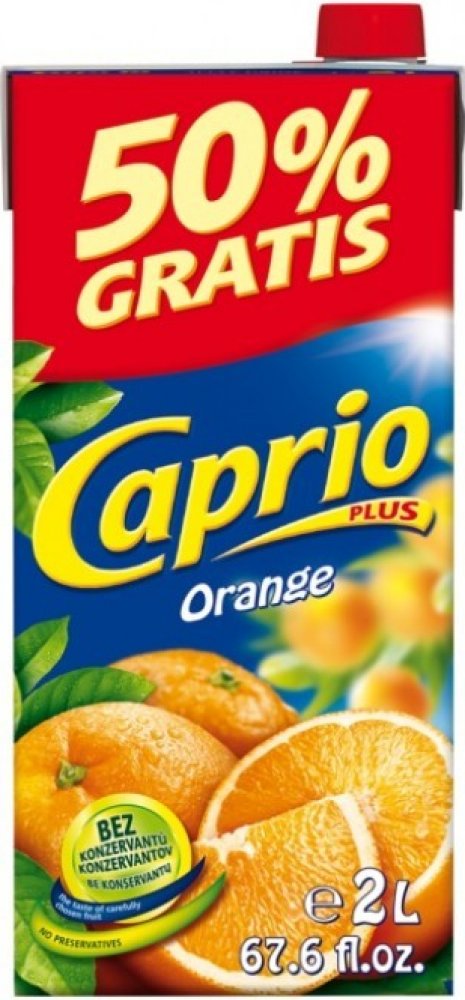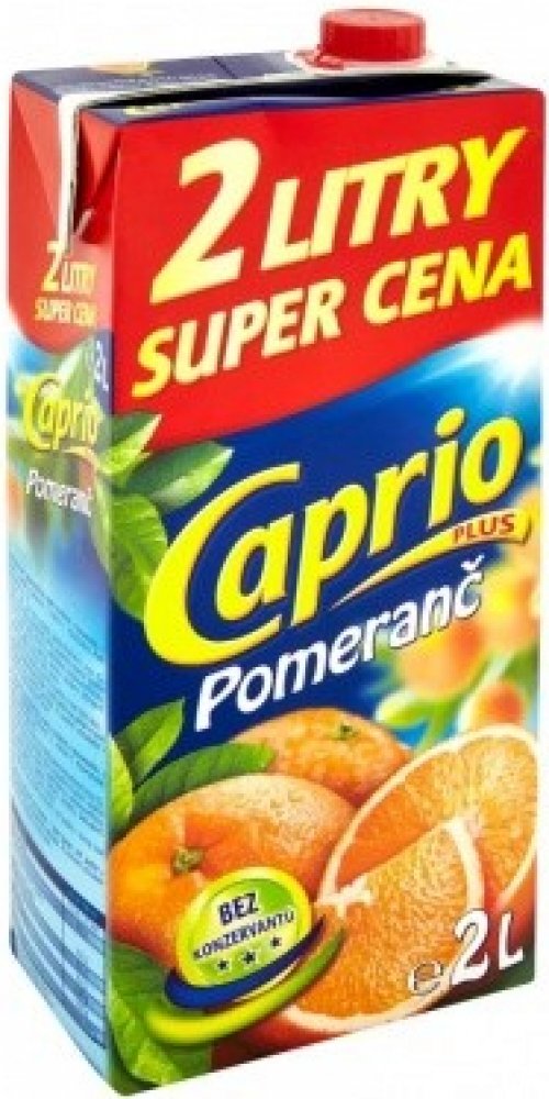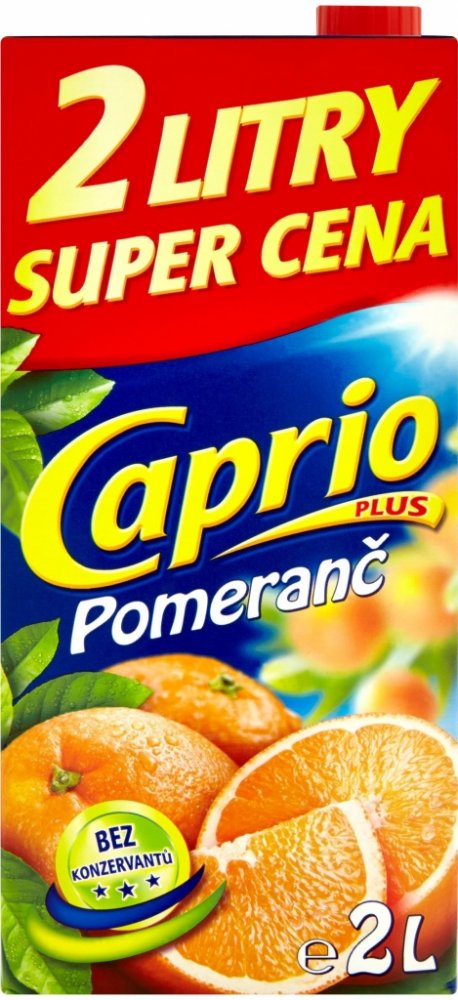 Bez konzervantů, Nejlepší k jídlu, Naše ovocné nápoje Caprio v balení 2L jsou vhodné pro každého, kdo ocení lahodné nápoje za příznivou cenu. Pomerančový nápoj Caprio je plný těch nejlepších pomerančů, samozřejmostí je, že je bez konzervantů., Nesycený pomerančový nápoj vyrobený z koncentrátu, s cukry a sladidly, Obohaceno o vitamin C.Pasterizováno.Podíl ovocné šťávy: 4%.,