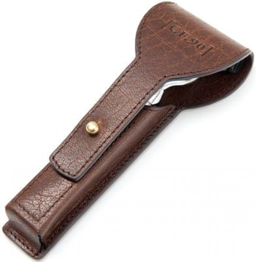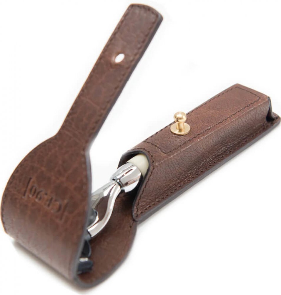 Holící strojek je dodávaný v ručně vyrobeném pouzdře z tříselně činěné hovězí kůže nejvyšší kvality. Ideální cestovní kombinace.