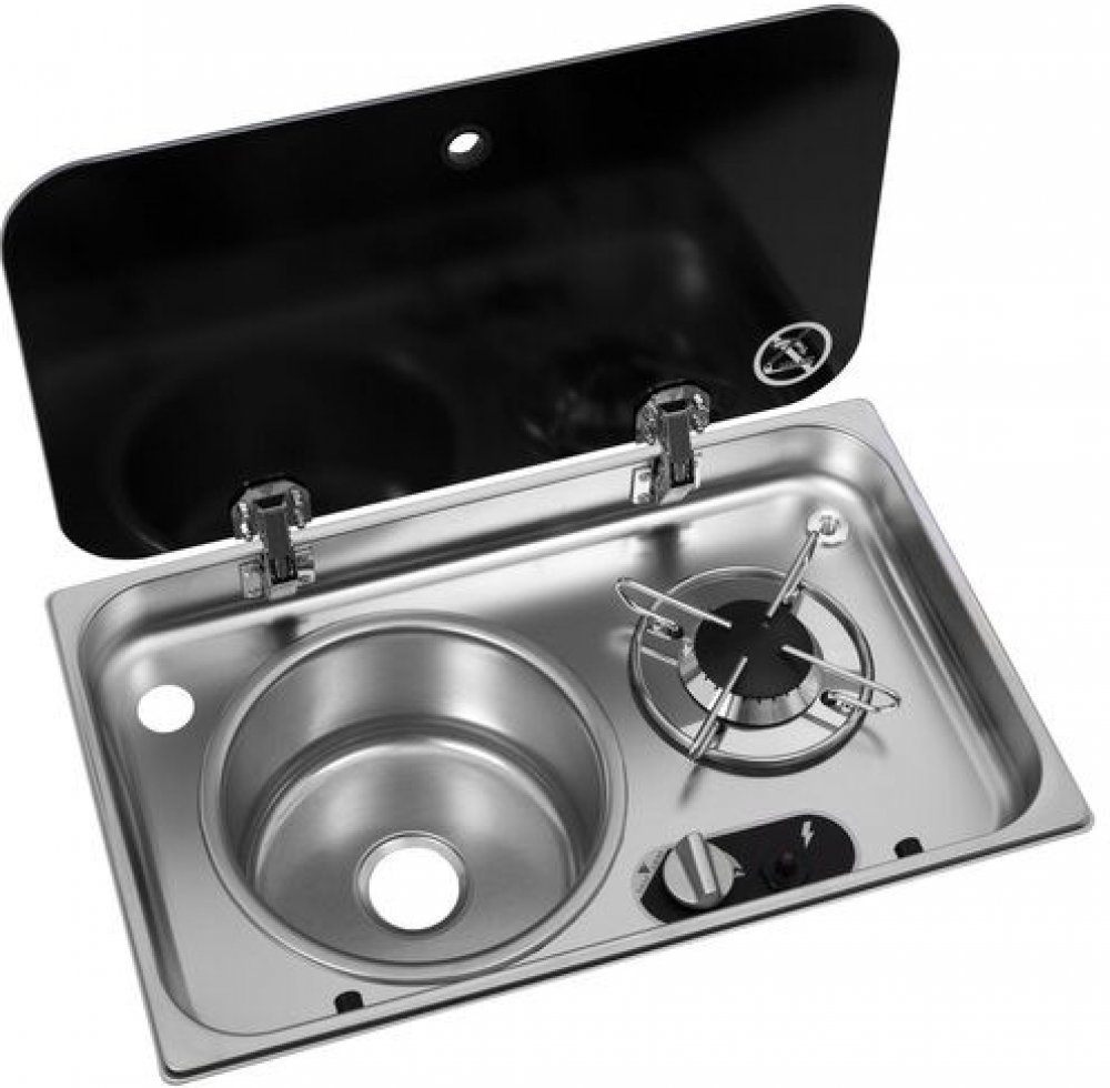 Kombinovaný jednoplotýnkový dřez se sklopným krytem je ideálním řešením pro kuchyňský kout obytného vozu, karavanu nebo vestavby.