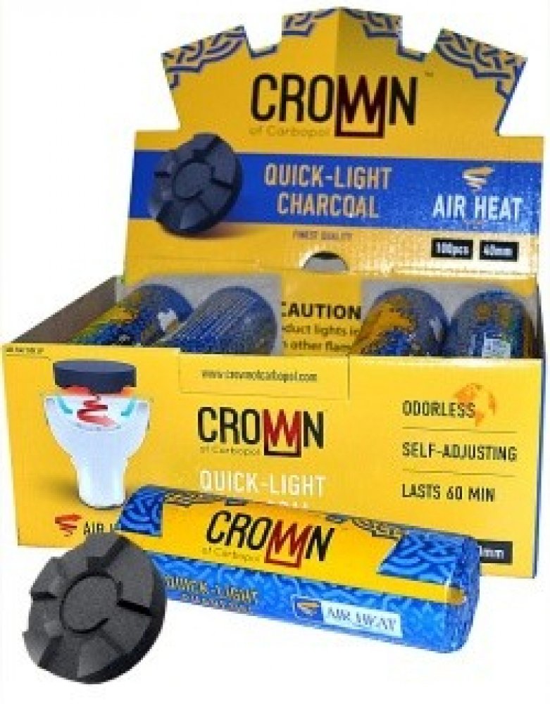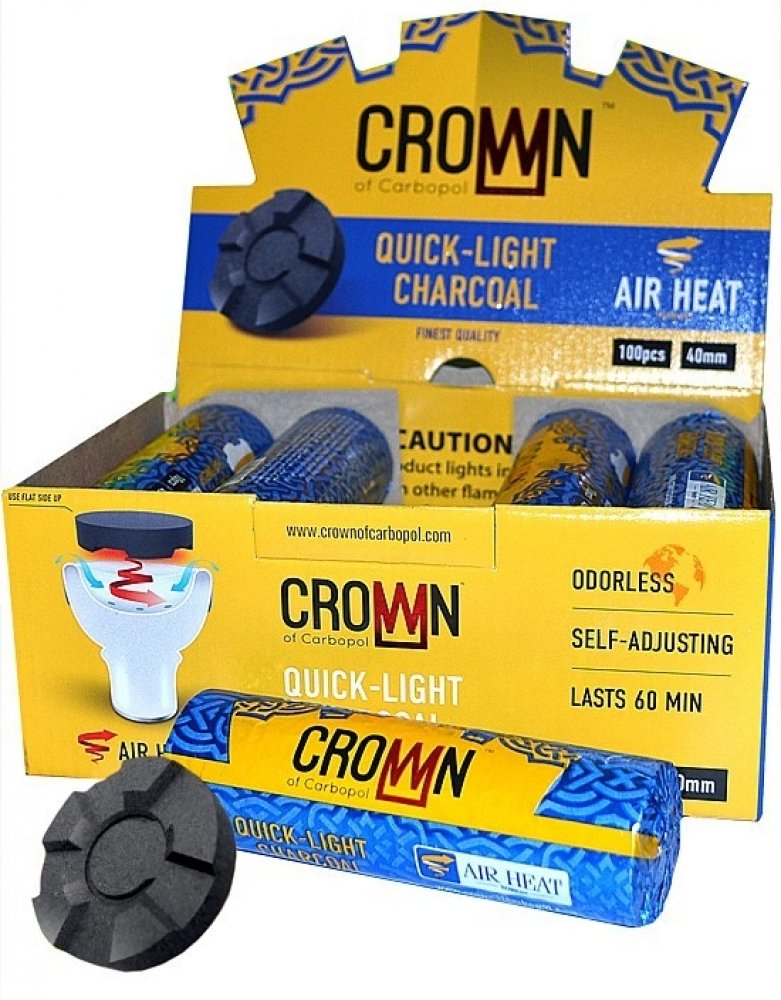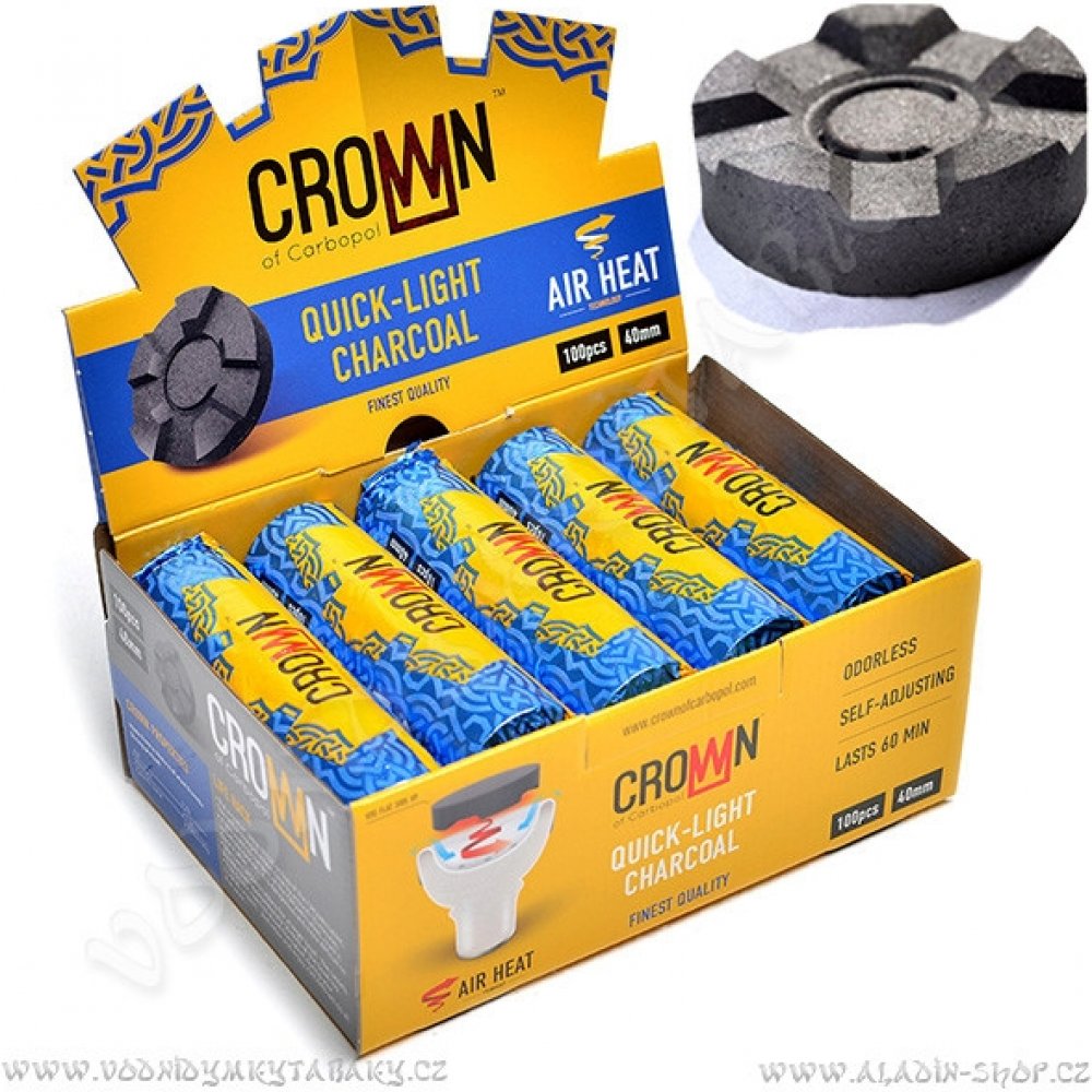 Rychlozápalné uhlíky Carbopol Crown 40 mm důmyslně tvarované do tvaru korunky. Díky systému Air Heat dochází k rovnoměrnému prohřívání a tabák v korunce se nepřepaluje. Žádný zápach a doba hoření až 60 minut dělají z uhlíků Carbopol Crown skvělý produkt.