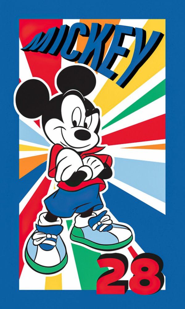 Dětský froté ručník s motivem postavičky Mickeyho Mouse na modro-žluto-červeném podkladu . Ručníček je vyroben v rozměru 30 x 50 cm z vysoce kvalitní 100% bavlny v gramáži 320 g/m2, díky čemuž je měkký a příjemný k pokožce.
