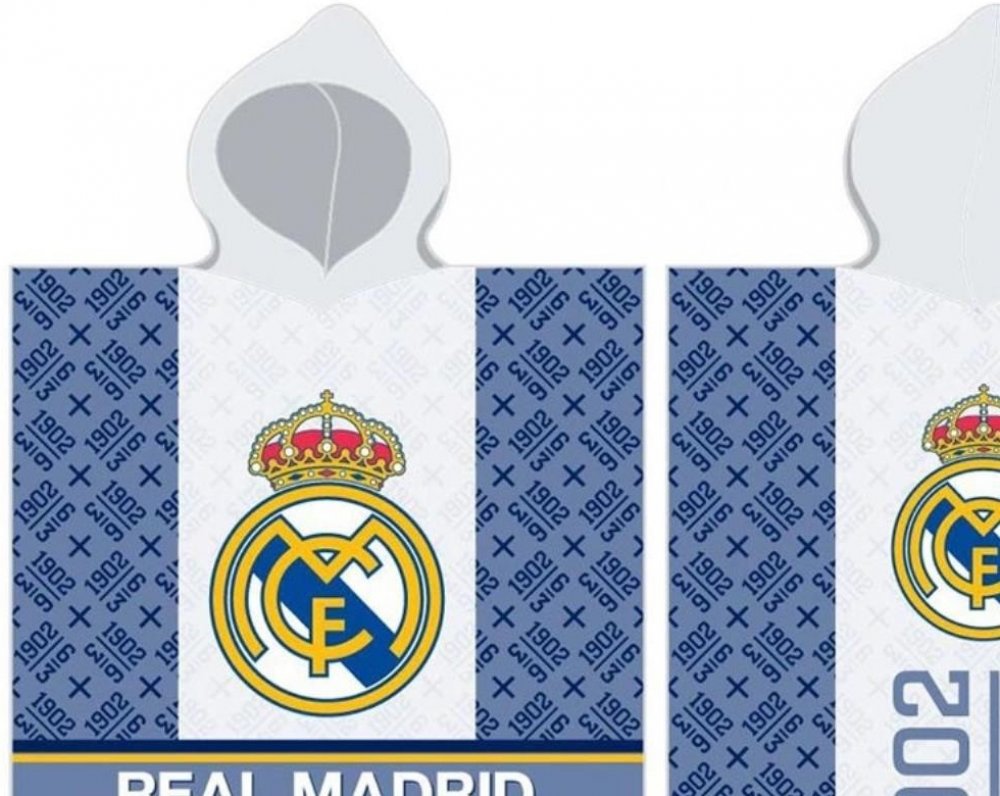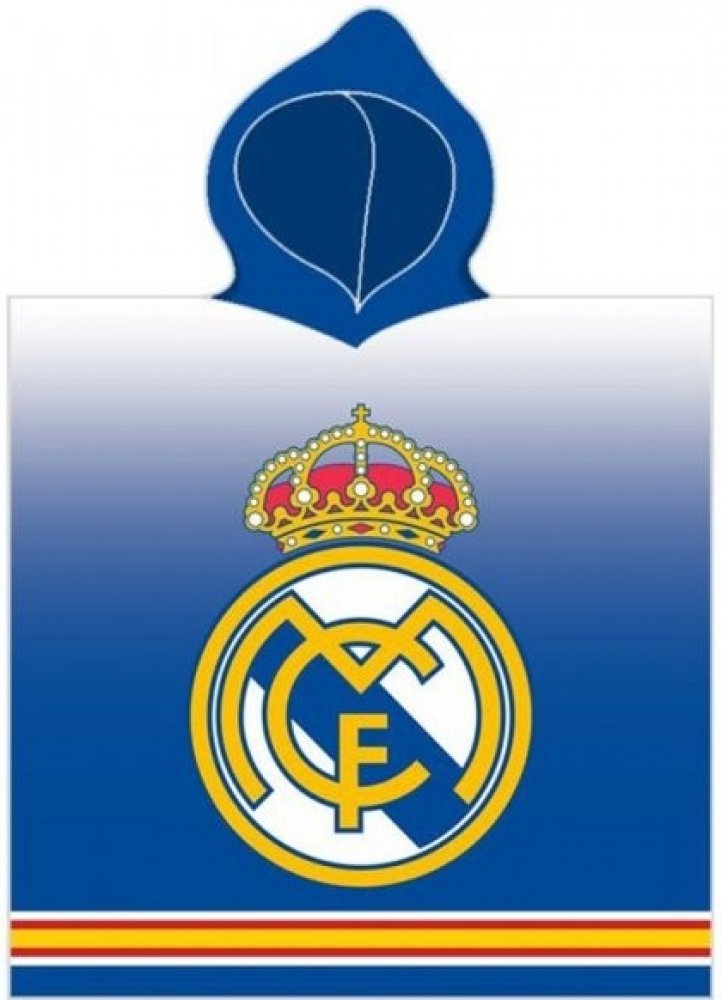 Dětská plážová osuška s kapucí / dětské pončo FC Real Madrid - vyrobené z příjemně jemného a dobře savého 100% bavlněného froté gramáže 300 gr./m2. Pončo je v klubových barvách se znakem fotbalového mančaftu Real Madrid z přední i zadní strany. Rozměry tohoto ponča pro malé fotbalové fanoušky RMCF jsou 55 x 110 cm
