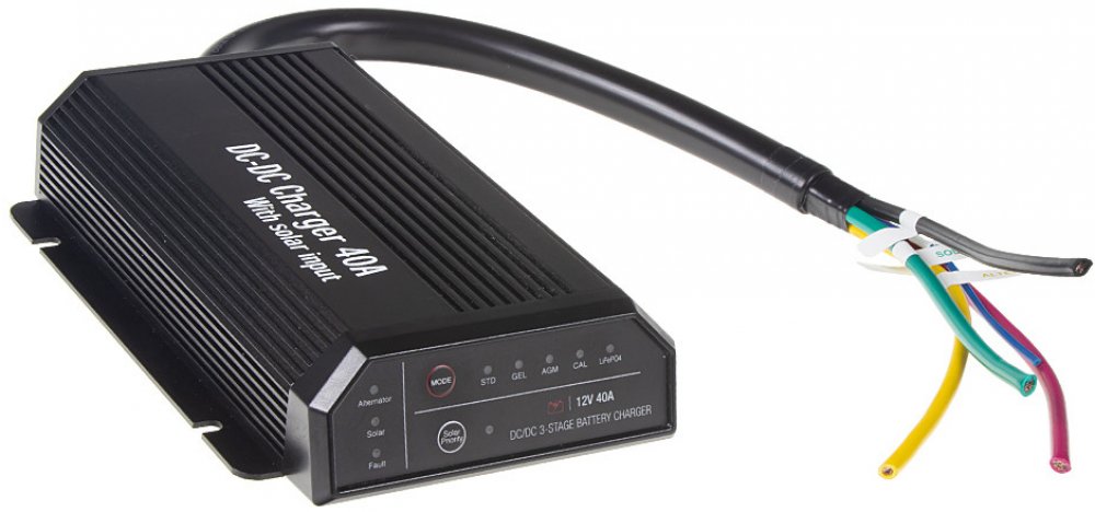 DC-DC 40 A Inteligentní nabíječka baterií je určena k nabíjení sekundární (pomocné) baterie během jízdy pomocí primární (startovací) baterie připojené k alternátoru nebo pomocí solárního panelu.