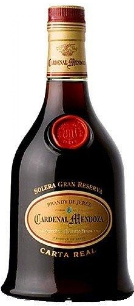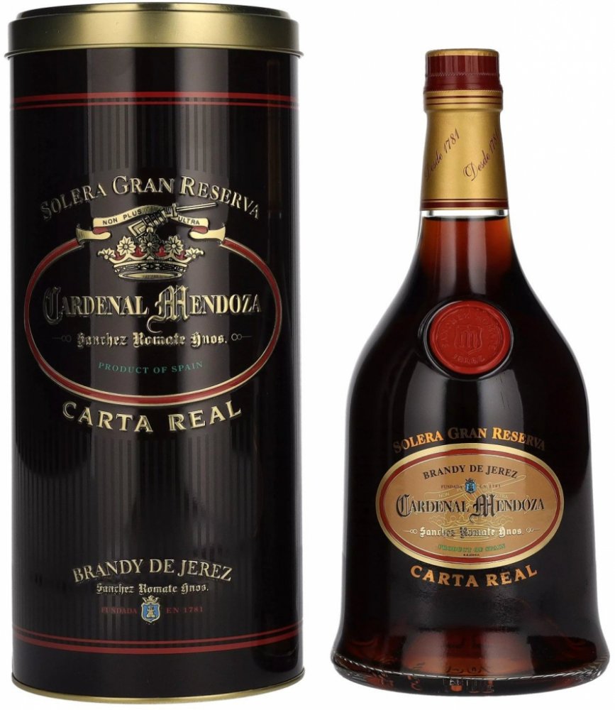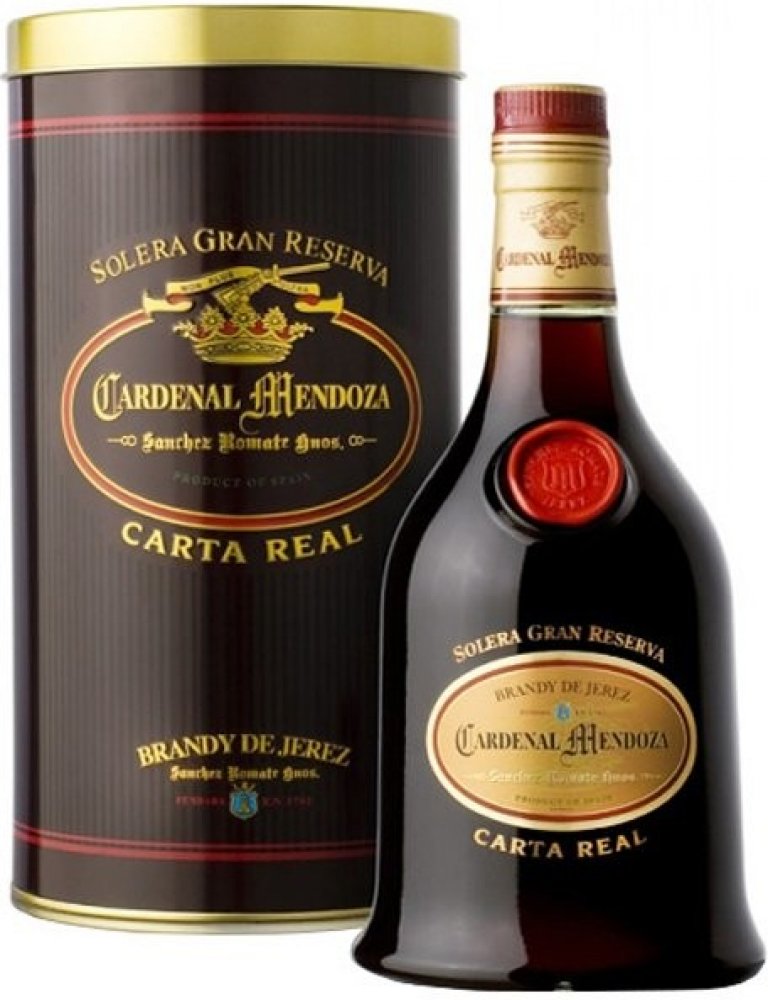 Nejlepší brandy z palírny Cardinal Mendoza a pravděpodobně nejlepší brandy na světě! Tato vynikající brandy, která se nachází v srdci oblasti sherry, zraje více než 25 let tradiční metodou v propracovaném procesu Solera. Sudy na to byly zakoupeny v Americe, z amerického bílého dubu. Sherry zrálo v těchto malých dubových sudech několik let a kontakt Cardinal Mendoza Carta Real Brandy je díky malým sudům vyšší, což je chuťově nezanedbatelné. Carta Real Brandy z rodiny Sanches Romate získala několik mezinárodních ocenění. Cardinal Mendoza Carta Real Brandy je přísně limitována a každá z lahví má své sériové číslo.