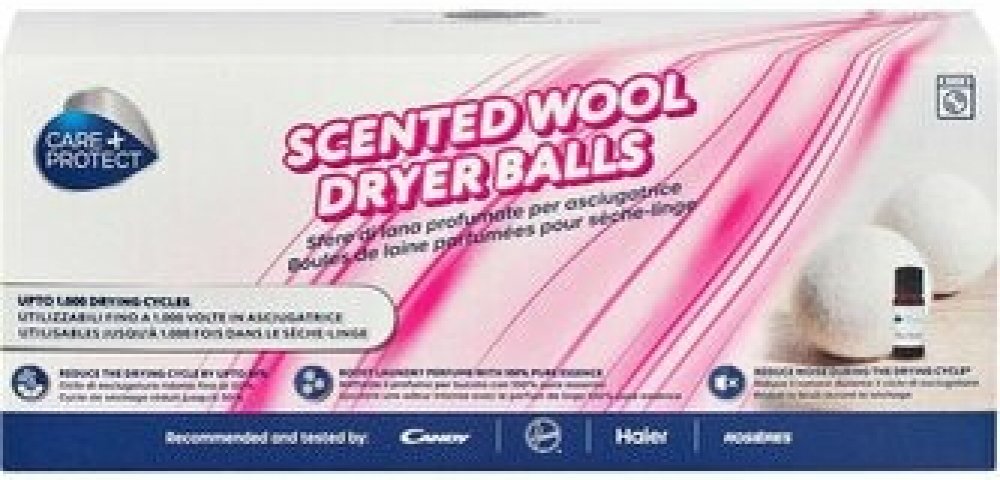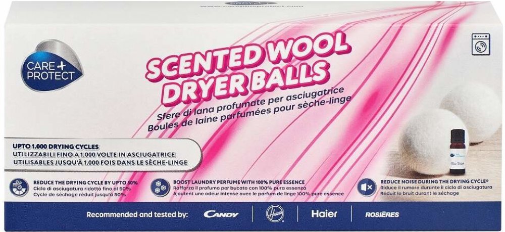 Parfémované vlněné míčky do sušičky, zkracují dobu sušení na polovinu, šetří energii, dodávají oblečení jedinečnou měkkost, usnadňují žehlení a zanechávají čerstvou a dlouhotrvající vůni, vyrobené z přírodní vlny, opakovaně použitelné až pro 1000 cyklů, esence na prádlo Care+Protect Blue Wash