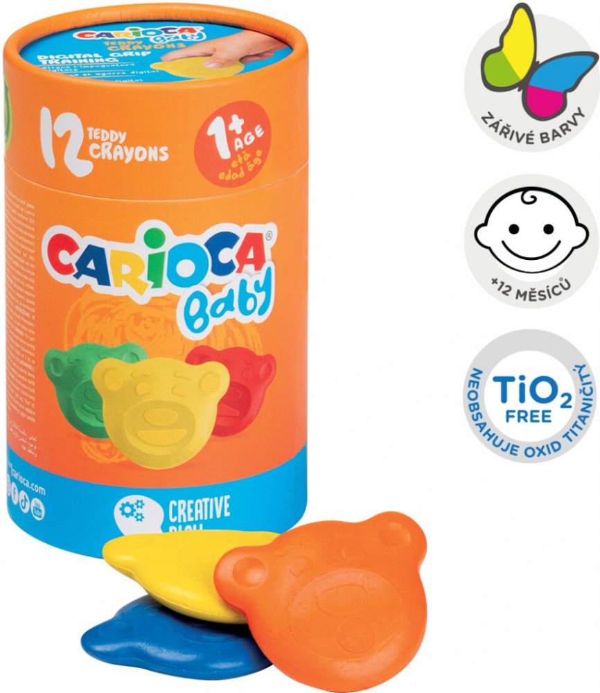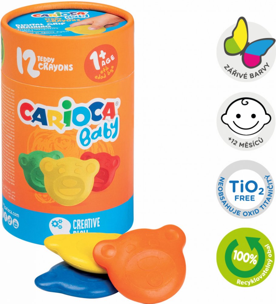 Objevte svět barev s Carioca Baby Teddy voskovky! Tato sada obsahuje 12 barevných voskovek, které jsou speciálně navrženy pro malé dětské ruce.. Ergonomický tvar a měkká textura voskovek usnadňují kreslení a podporují rozvoj jemné motoriky. Ideální pro děti od jednoho roku, aby mohly bezpečně a zábavně objevovat svou kreativitu. Sada 12 barevných voskovek Ergonomický tvar pro snadné držení Měkká textura pro snadné kreslení Vhodné pro děti od jednoho roku Bezpečné a netoxické materiály Voskovky Carioca Carioca Baby Teddy voskovky jsou perfektní volbou pro malé umělce, kteří se teprve začínají učit kreslit. Tyto voskovky jsou navrženy tak, aby byly pohodlné na držení a snadno se používaly i těm nejmenším dětem. Ergonomický tvar umožňuje pevný úchop a kontrolu, což podporuje správné držení a rozvoj jemné motoriky. Voskovky mají měkkou texturu, která umožňuje snadné a plynulé kreslení bez velkého tlaku. To znamená, že děti mohou tvořit jasné a živé kresby s minimální námahou. Voskovky jsou také velmi odolné, takže vydrží dlouhodobé používání i při intenzivním kreslení. Carioca Baby Teddy voskovky jsou vyrobeny z bezpečných a netoxických materiálů, což zaručuje jejich vhodnost pro malé děti. Jsou ideální pro použití doma, ve školce nebo na cestách. Tato sada je skvělým dárkem pro malé děti, které se chtějí ponořit do světa barev a kreativity. Skladování Pro tyto popisovače není potřeba žádné speciální skladování, dbejte však na to, aby byly v suchu a nevystavujte je nadměrným nebo extrémně nízkým teplotám, které by mohly mít vliv na kvalitu barev. V případě nepříznivých venkovních teplot (nad 25 °C a pod 5 °C) nedoporučujeme jejich zaslání do venkovních výdejních míst. Zboží poškozené vlivem počasí bohužel není možné reklamovat. Upozornění Pozor nenechávejte dítě mladší 3 let samotné při práci s těmito výtvarnými produkty, doporučujeme dohled dospělé osoby. Prosím, přečtěte si varování na obalu a dodržujte je.