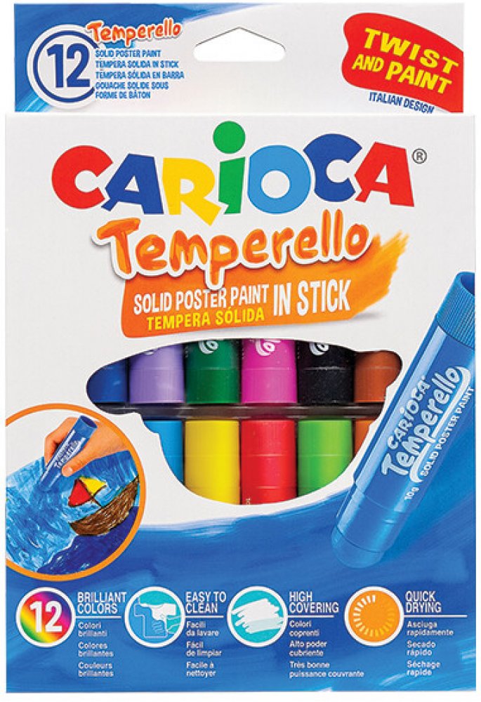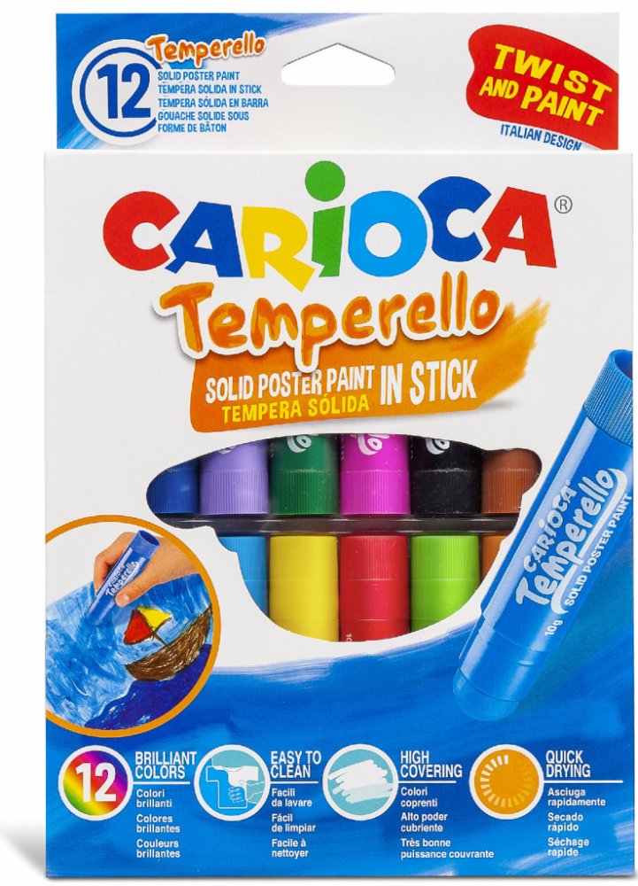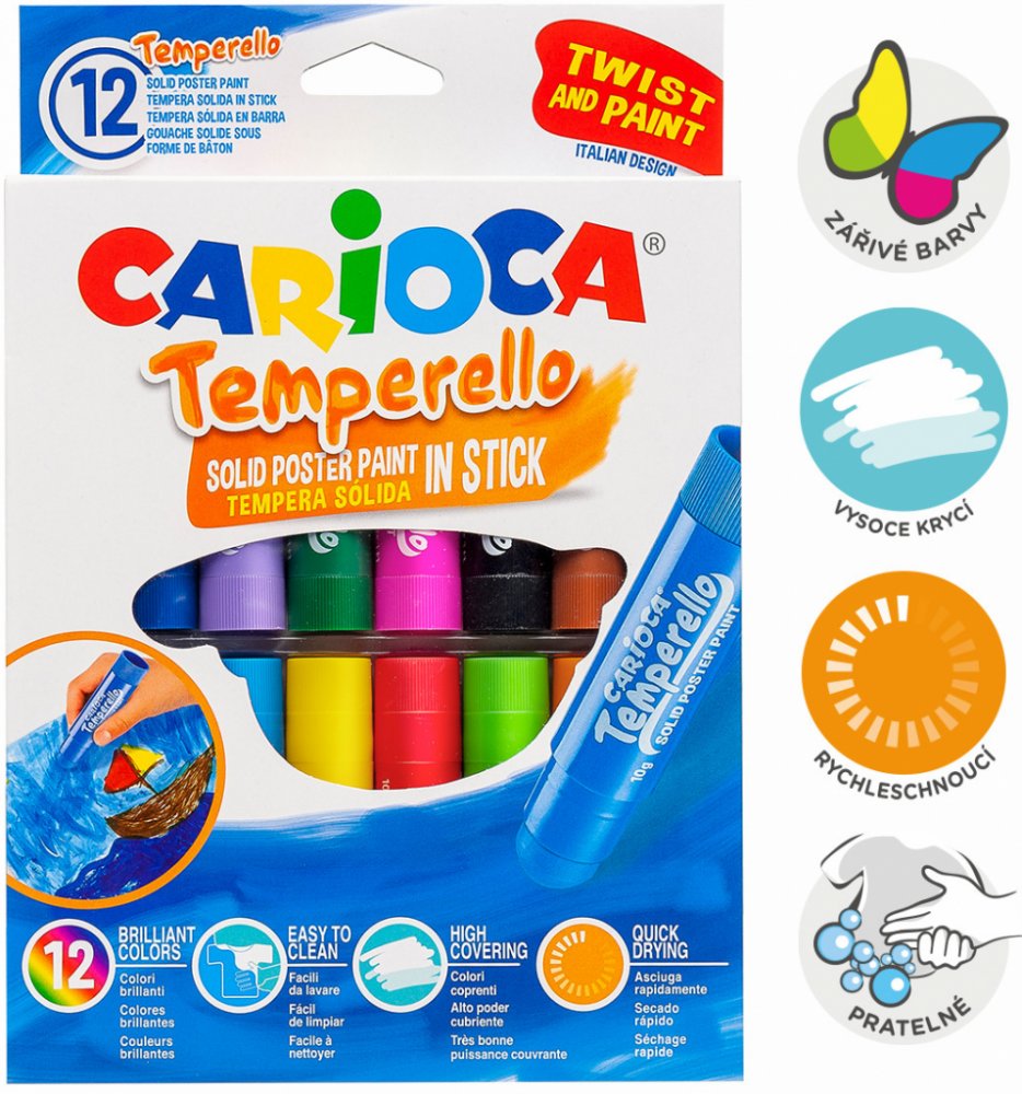 S pevnou konzistencí a snadným čištěním jsou bezpečnou volbou pro všechny rodiče. Nechte své děti objevovat radost z malování s těmito bezpečnými a zábavnými barvami. vysouvací barvy v tyčince značky Carioca ideální ke kreslení a malování na světle zbarvený papír či karton po zaschnutí vytvářejí saténový matný efekt podle vyvíjení tlaku můžete dosáhnout různé povrchové úpravy: lehký tlak - pastelový efekt, silný tlak - temperový efekt hotová kresba nepraská a je pružná schnou za méně než 3 min neobsahují rozpouštědla ruce, díky tyčince a složení barev, zůstávají čisté barvy lze okamžitě po nanesení mísit a dosahovat různých odstínů obsah balení 12 ks základních barev jedna barva má 10 g Temperové barvy v tyčince Carioca Rodiče, pozor! Temperové barvy v tyčince značky Carioca jsou skvělým způsobem, jak přinést do vašich domovů radost a kreativitu. Tyto barvy mají pevnou konzistenci a jsou v plastovém pouzdře, což znamená, že nešpiní a dítě si může užít tvorbu bez obav o čistotu. Navíc jsou snadno omyvatelné, bez zápachu a neobsahují škodlivá rozpouštědla. Vaše děti je zamilují a novinka v jejich výtvarných pomůckách jim jistě udělá velkou radost a vyvolá nadšení! Skladování Zde není potřeba žádné speciální skladování, dbejte však na to, aby byl produkt v suchu a nevystavujte ho mechanickému poškození, které by mohly mít vliv na kvalitu.